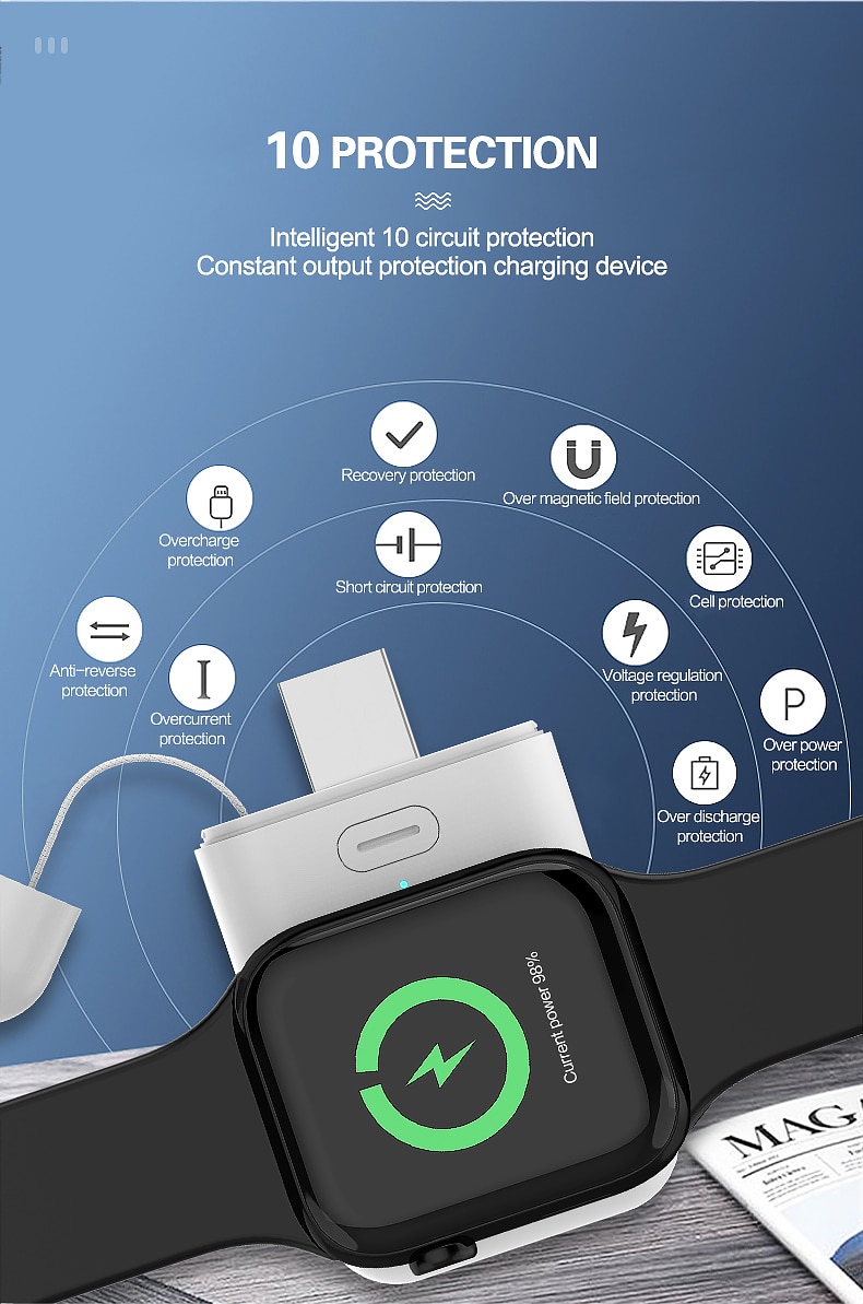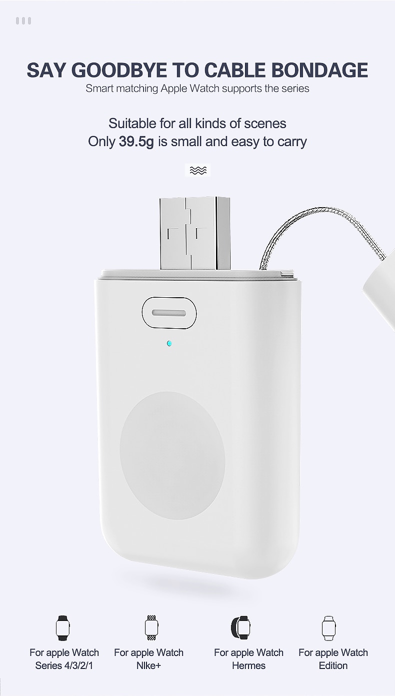 Capacity: 1000mAh Input: 5V/1.0A Max Output: 5V 400MA Plug: Micro USB Output Interface: Wireless Product Size: 15 x 40 x 67 mm Packing Size: 60 x 25 x 100 mm Product Weight: 39.5g Packing Weight: 56.5g Compatible With: Apple Watch 1 2 3 4 5 (Only the orders after October, 1st fit for apple watch 5)