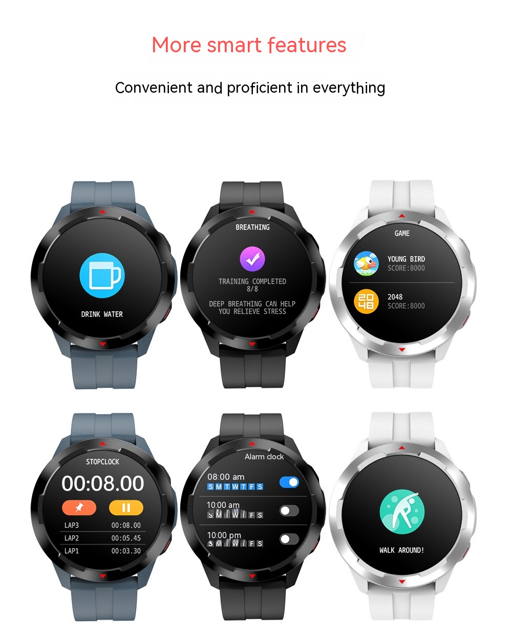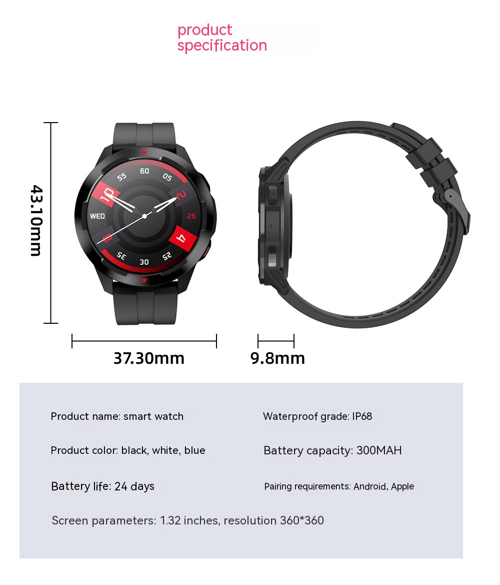 Additional features: Audio and video entertainment, step counting, monitoring, social entertainment, mobile payment, smart reminder, remote control selfie, health monitoring, information push, motion tracking, sleep analysis