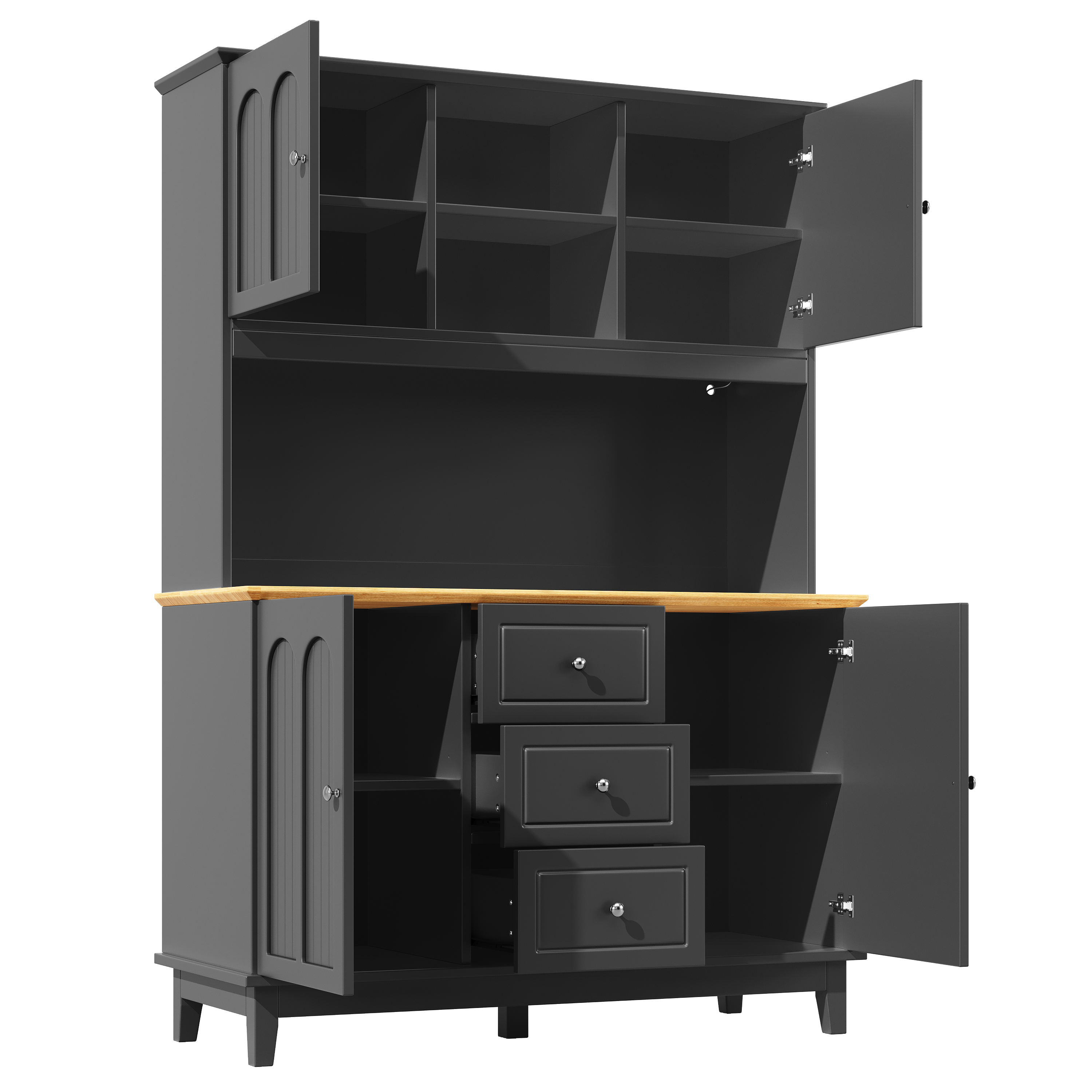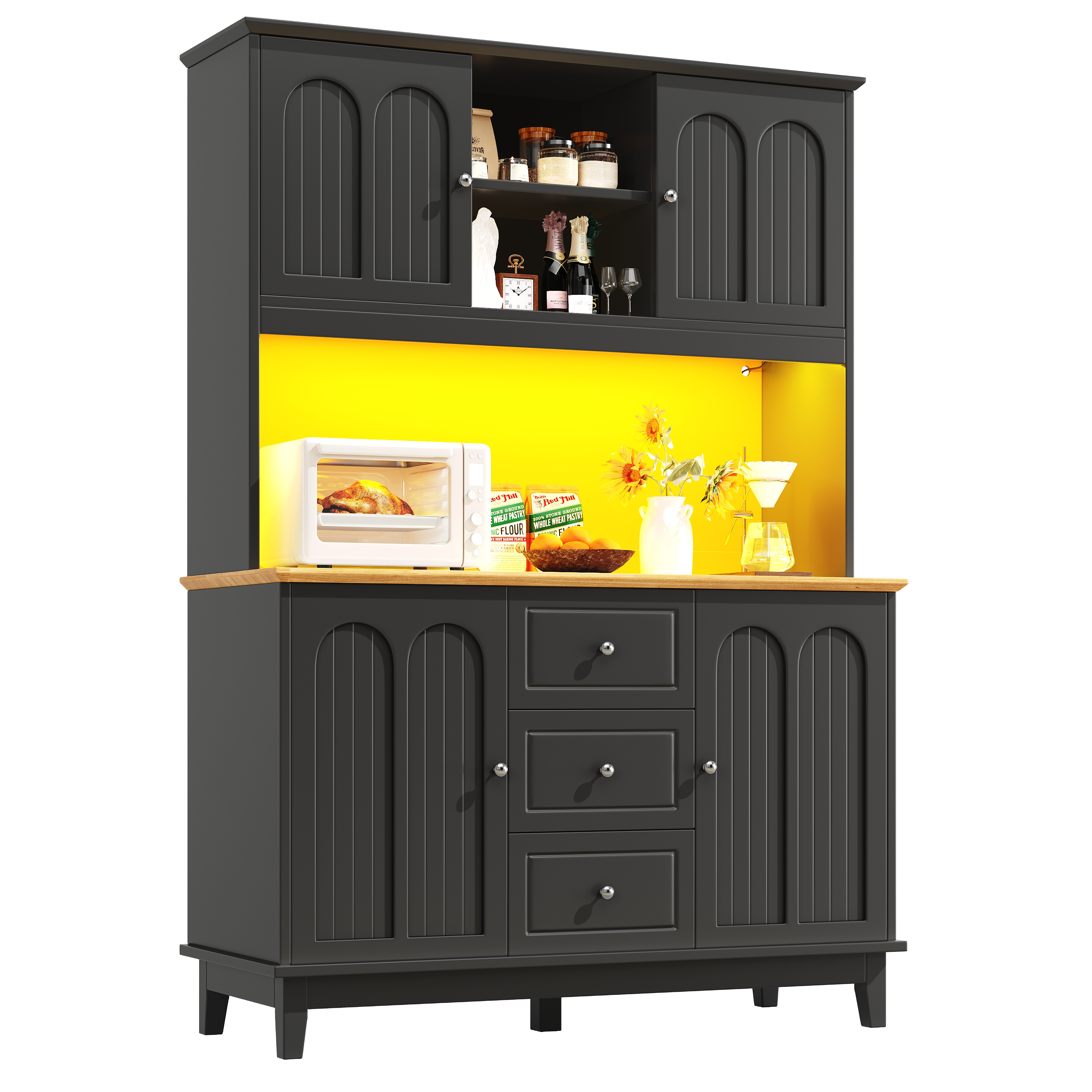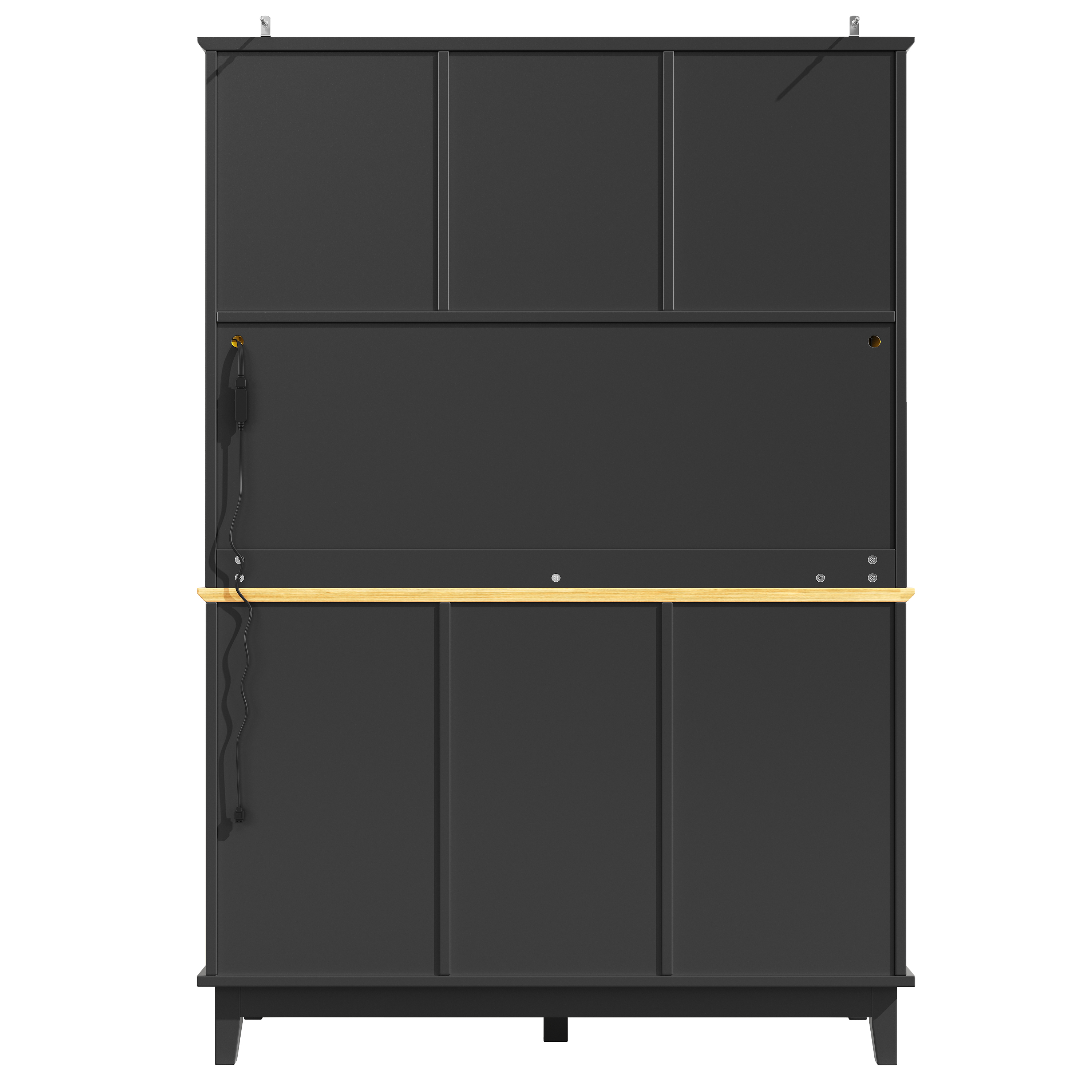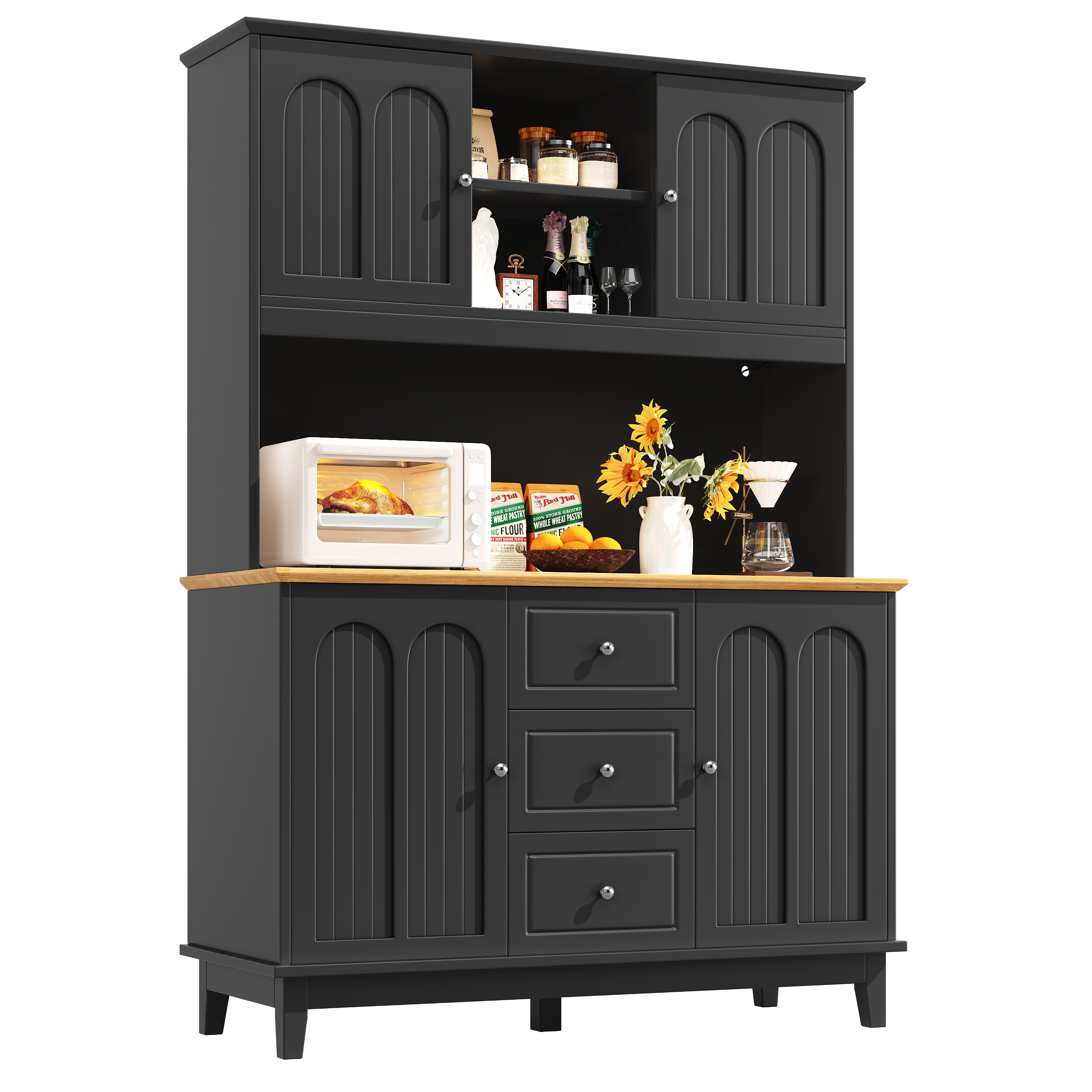 Equipped with multiple storage compartments, the upper section features an independent storage cabinet with lattice-patterned doors and adjustable shelves to accommodate various storage needs. The middle section is left open, ideal for placing items such as coffee makers, vases, and wineware for easy access. The bottom section includes closed cabinets and drawers to accommodate your storage needs, with adjustable shelves that can be customized to your requirements.