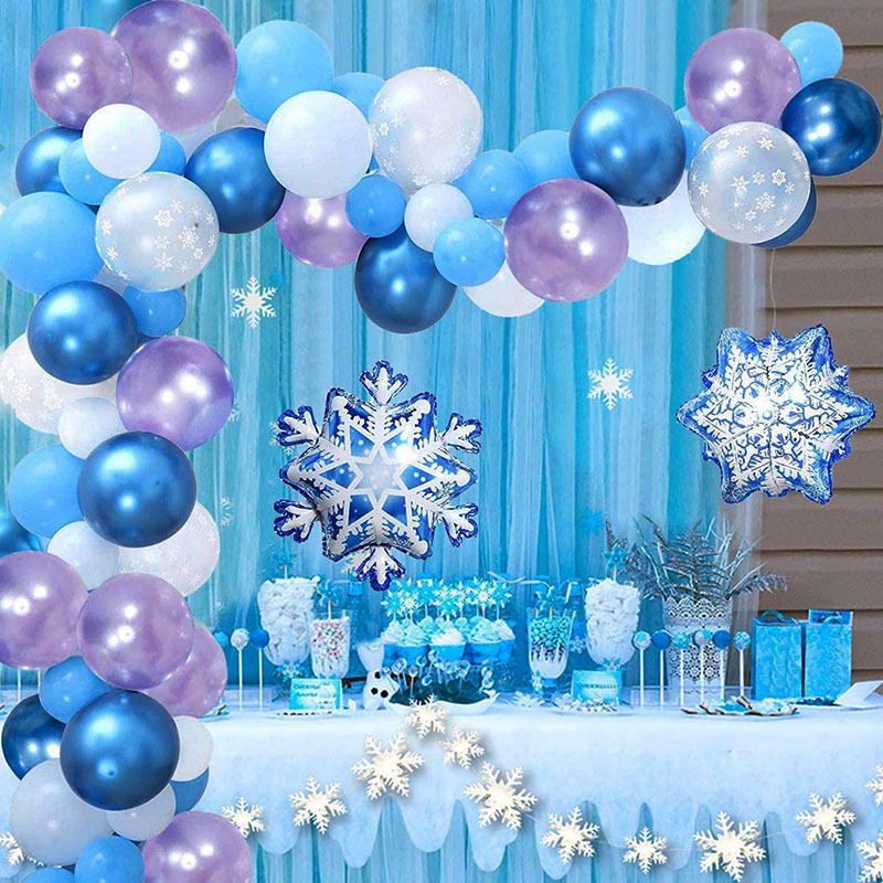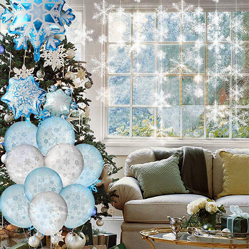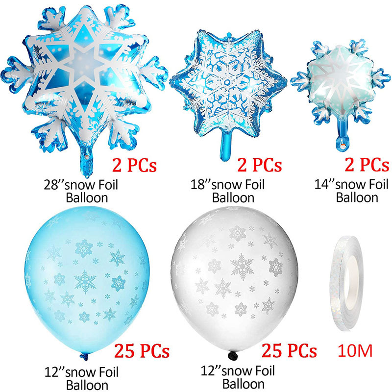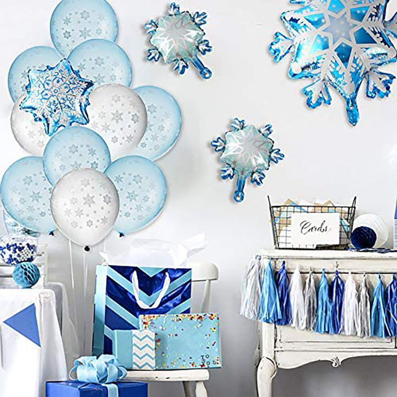 2 large snowflakes + 2 medium snowflakes + 2 mini snowflakes + 25 blue latex + 25 silver latex + 1 ribbon