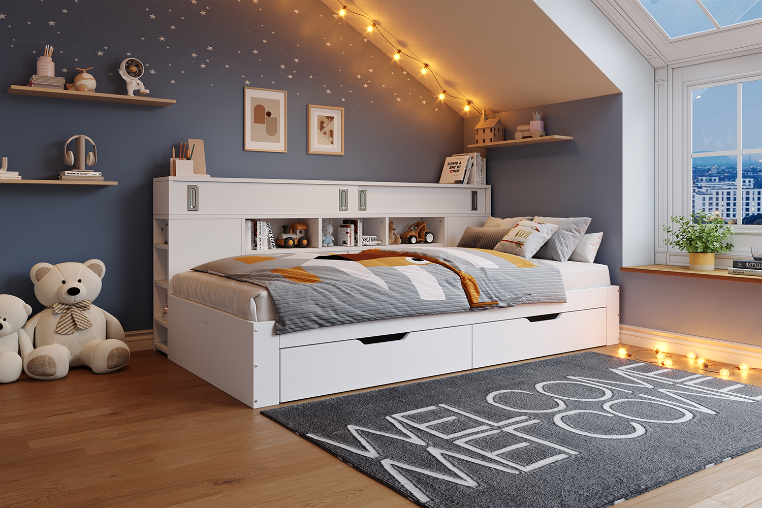 - Sliding door storage + wall-mounted mesh storage: a bed for multiple uses – Sliding door storage cabinets and open mesh shelves on the wall provide both privacy and storage display. Everyday items, books, and decorative items can all be neatly arranged, making efficient use of space.