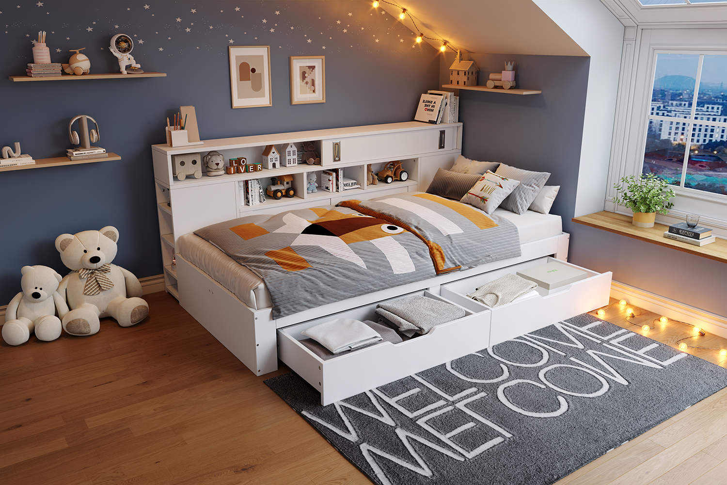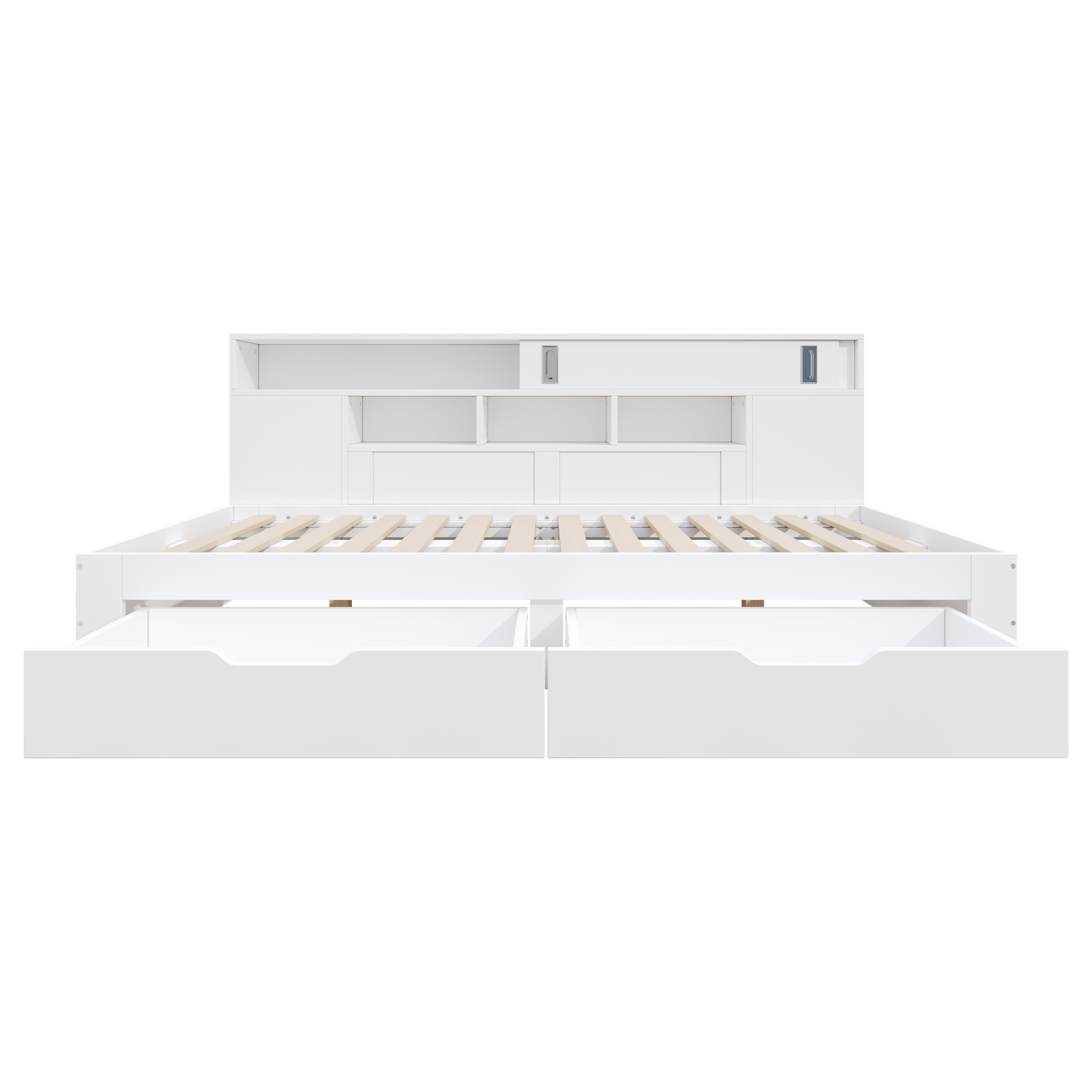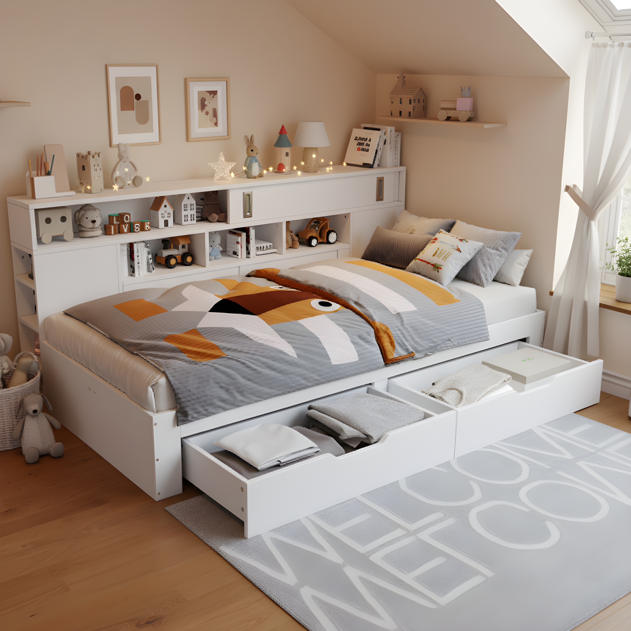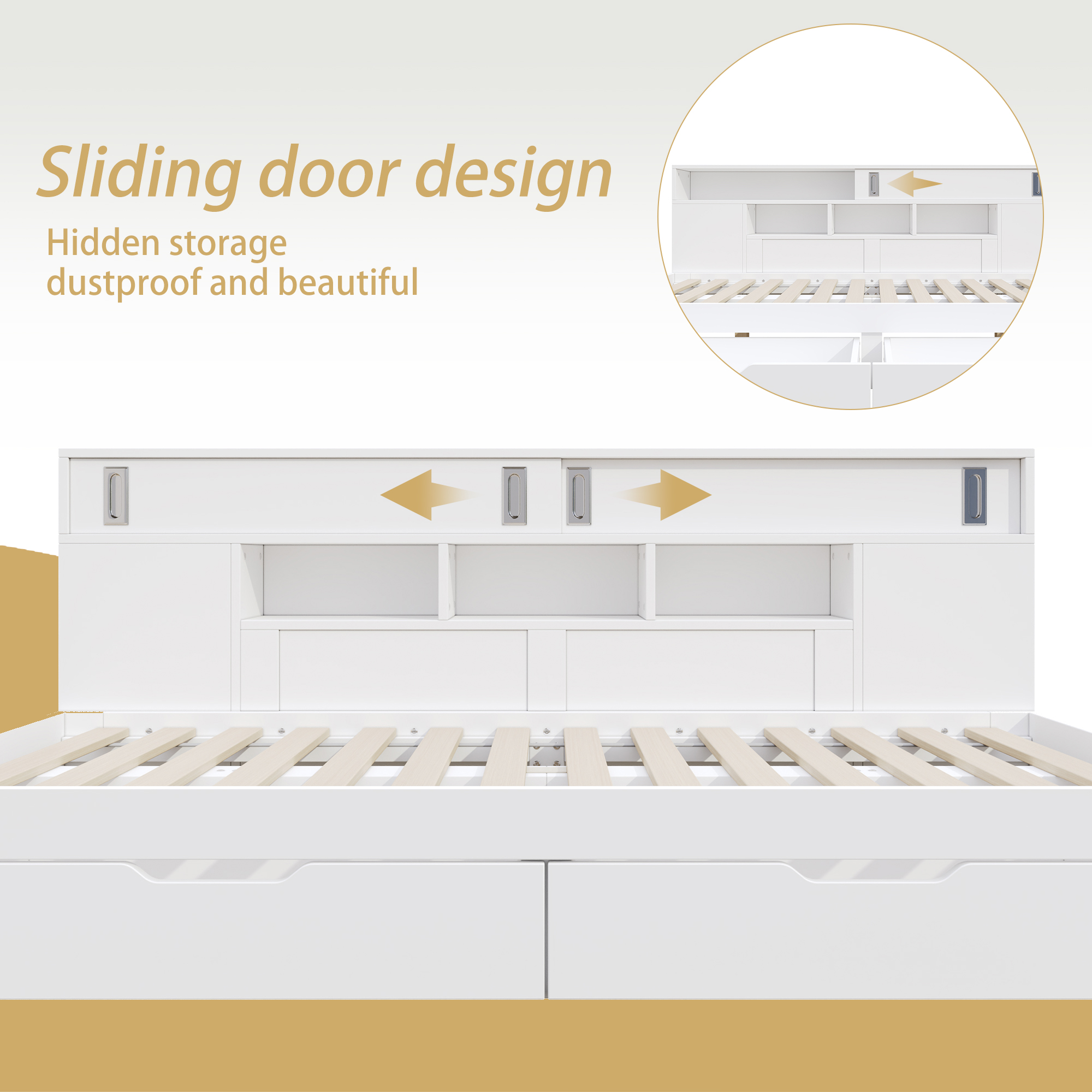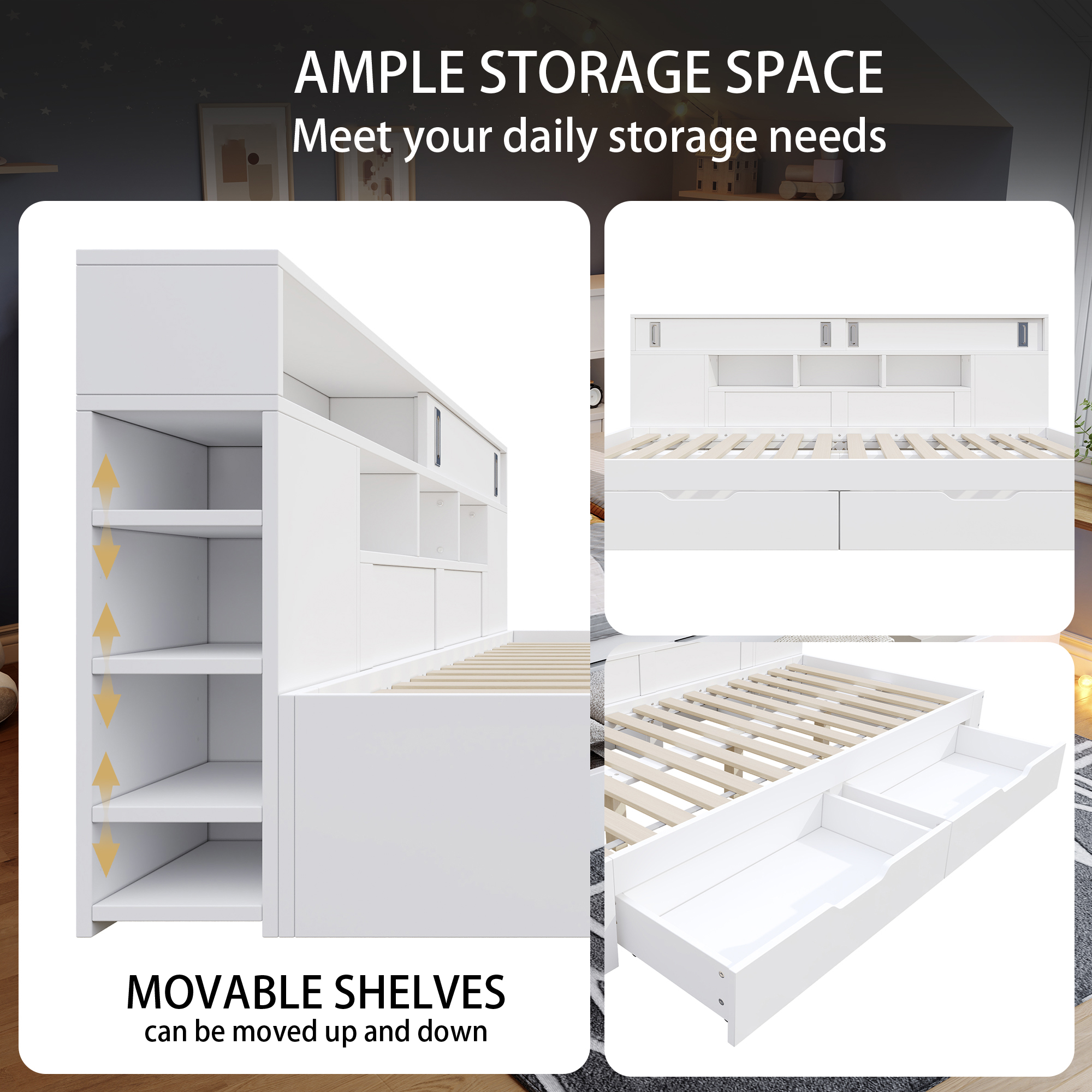 - Dual-drawer design for effortless organization – Two large-capacity drawers at the bottom conveniently store bedding, clothing, and other daily necessities. The drawers slide smoothly, allowing for easy and quiet access.