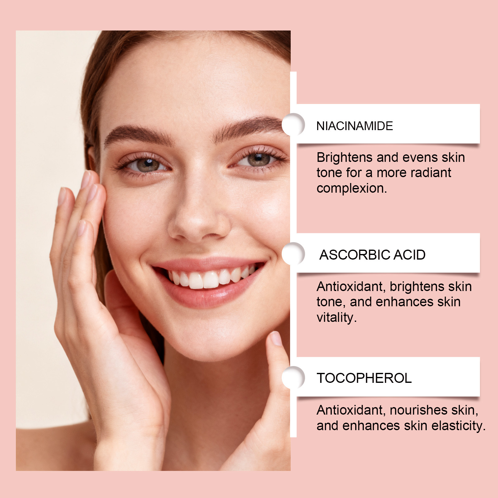 Ingredients: water, glycerin, hydroxyethyl cellulose, 1,2-hexanediol, hyaluronic acid, nicotinamide, ascorbic acid (vitamin C), tocopherol (vitamin E), collagen, disodium EDTA.