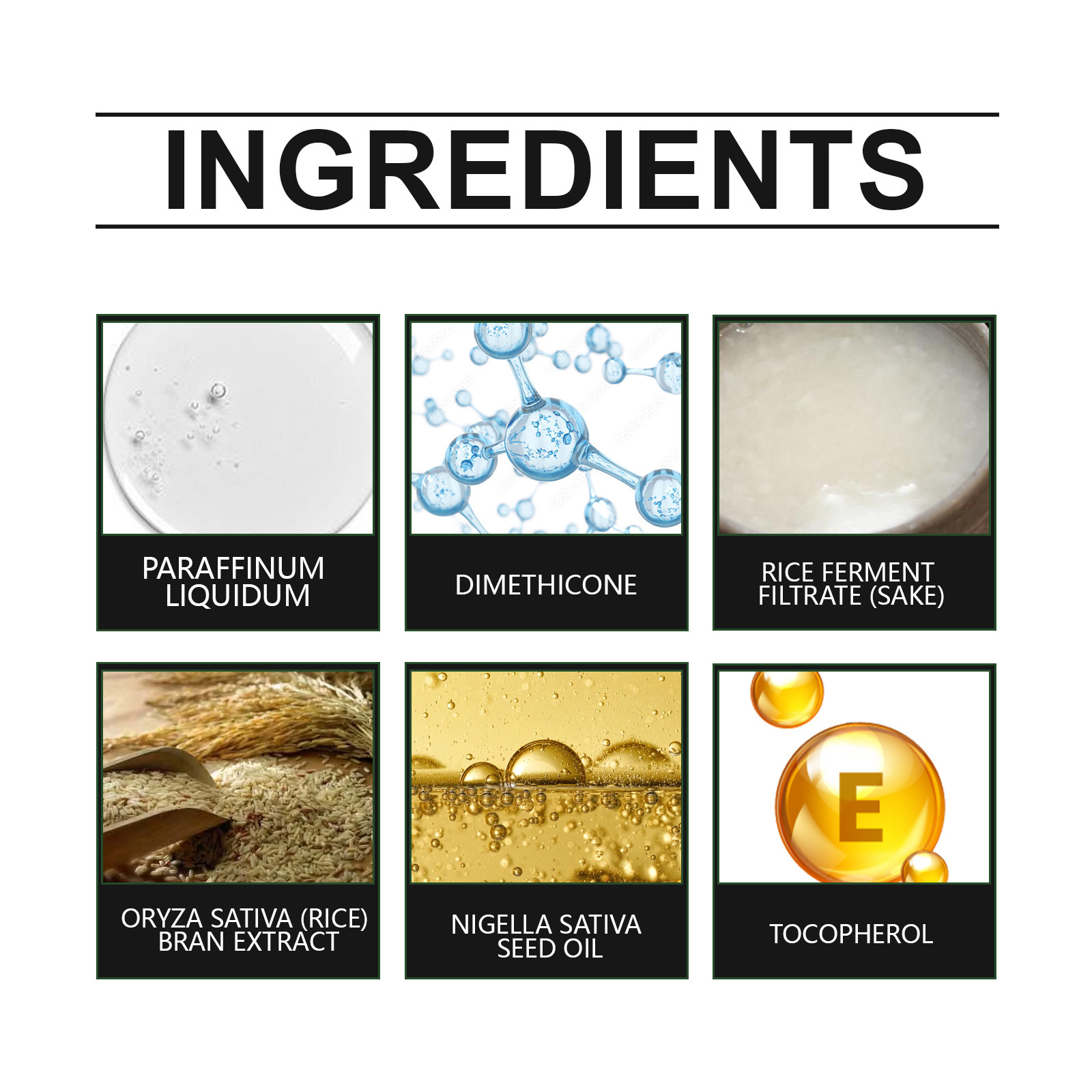 Product Ingredients: liquid paraffin, polydimethylsiloxane rice fermentation, Rice (Rice) bran extract, tocopherol (vitamin E), black seed oil