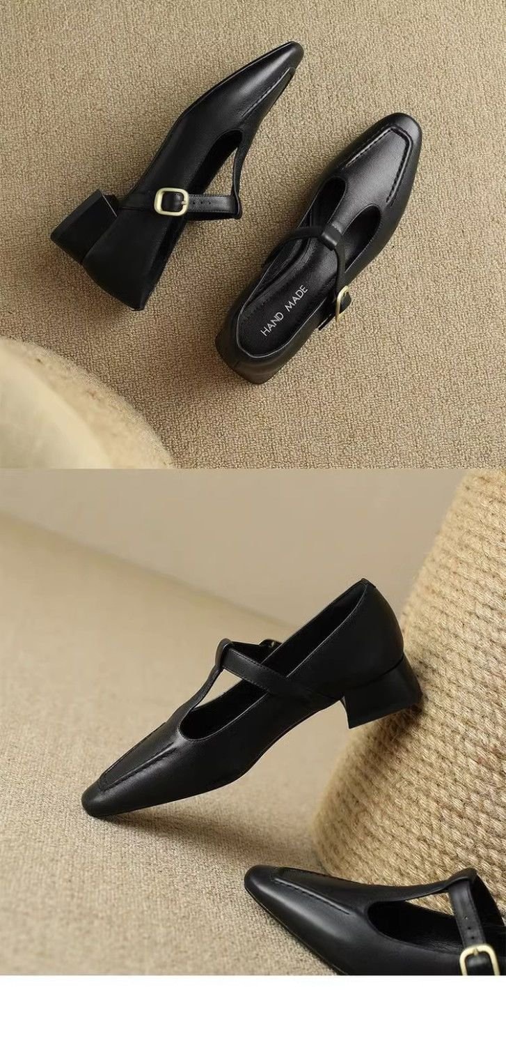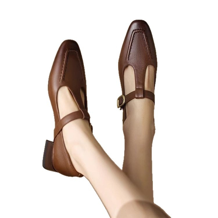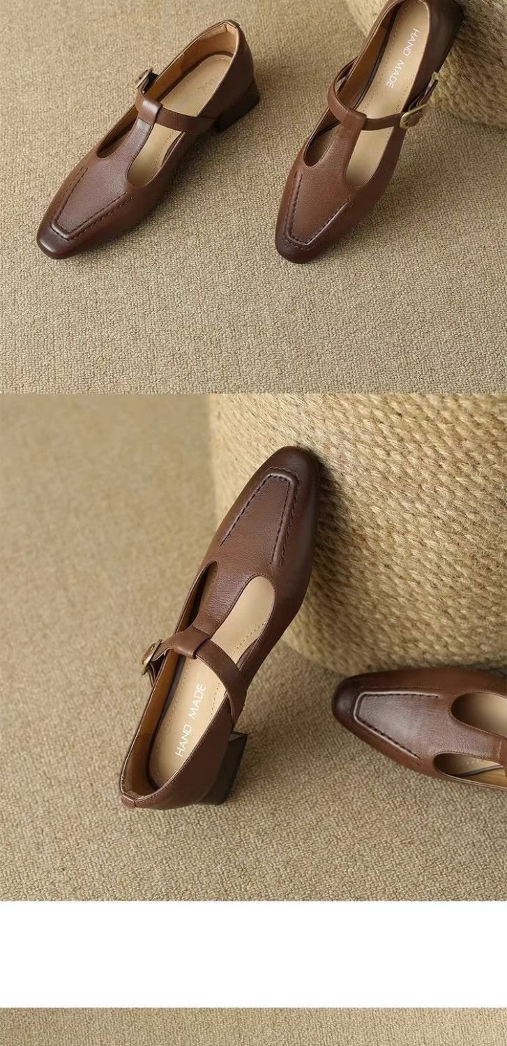 Soft Leather Brown T-strap Chunky Heel Pumps