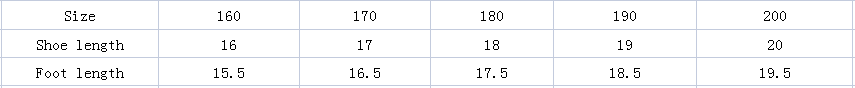 Size: [150] shoe inner length 15cm, recommended foot length 14.5cm, [160] shoe inner length 16cm, recommended foot length 15.5cm, [170] shoe inner length 17cm, recommended foot length 16.5cm, [180] shoe inner length 18cm, the recommended foot length is 17.5cm, [190] the shoe length is 19cm, the recommended foot length is 18.5cm, [200] the shoe length is 20cm, the recommended foot length is 19.5cm