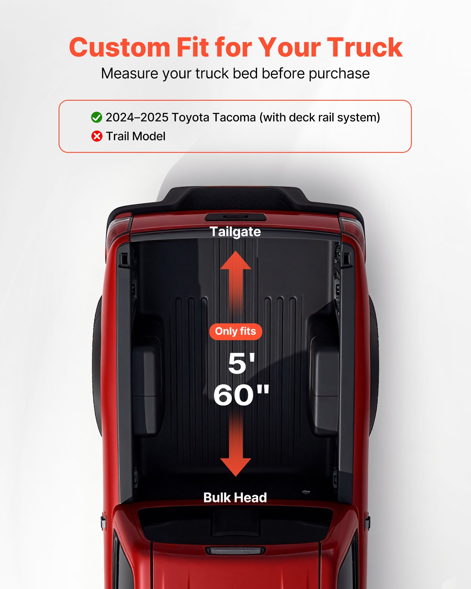 Vehicle Fitment: Our truck bed tonneau cover is compatible with 2024–2025 Toyota Tacoma with a 5 ft (60.5 in) bed and deck rail system (excl. Trail Edition). Please measure your truck bed before ordering