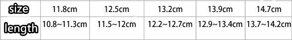 Sizes: size 19 / inner length 11.8cm, size 20 / inner length 12.5cm, size 21 / inner length 13.2cm, size 22 / inner length 13.9cm, size 23 / inner length 14.7cm