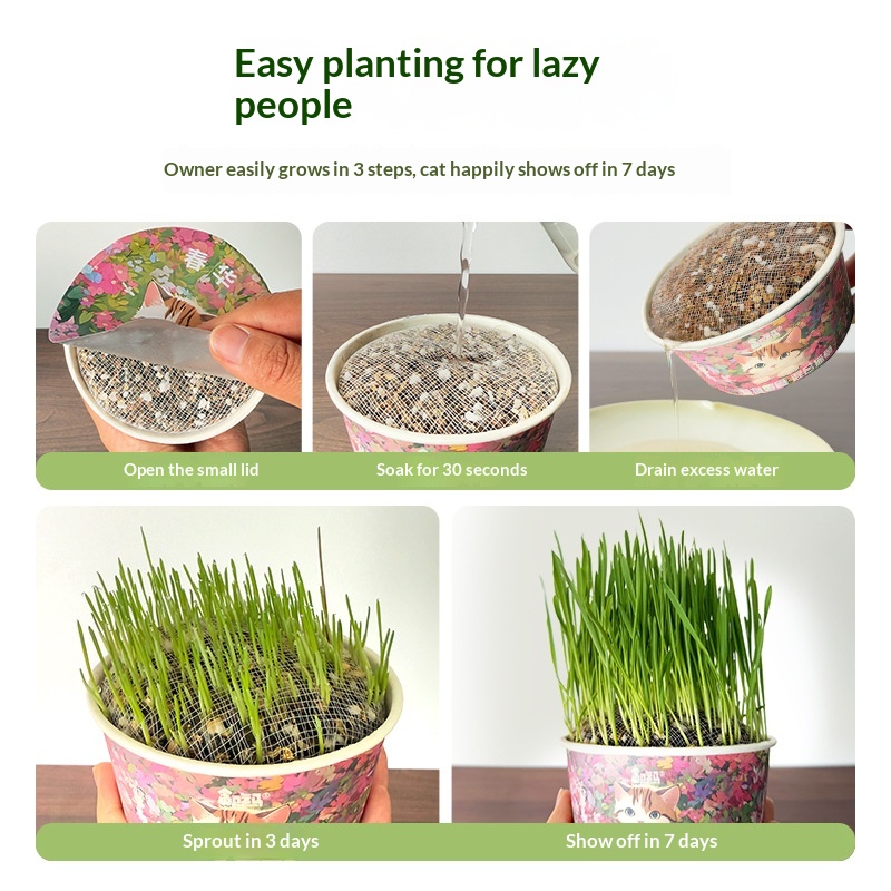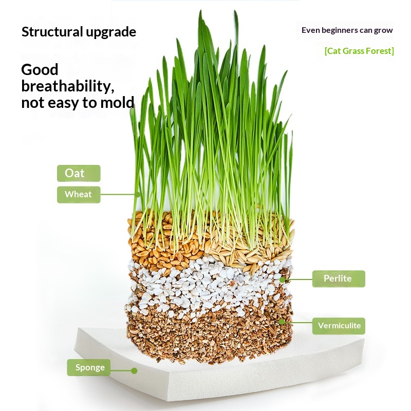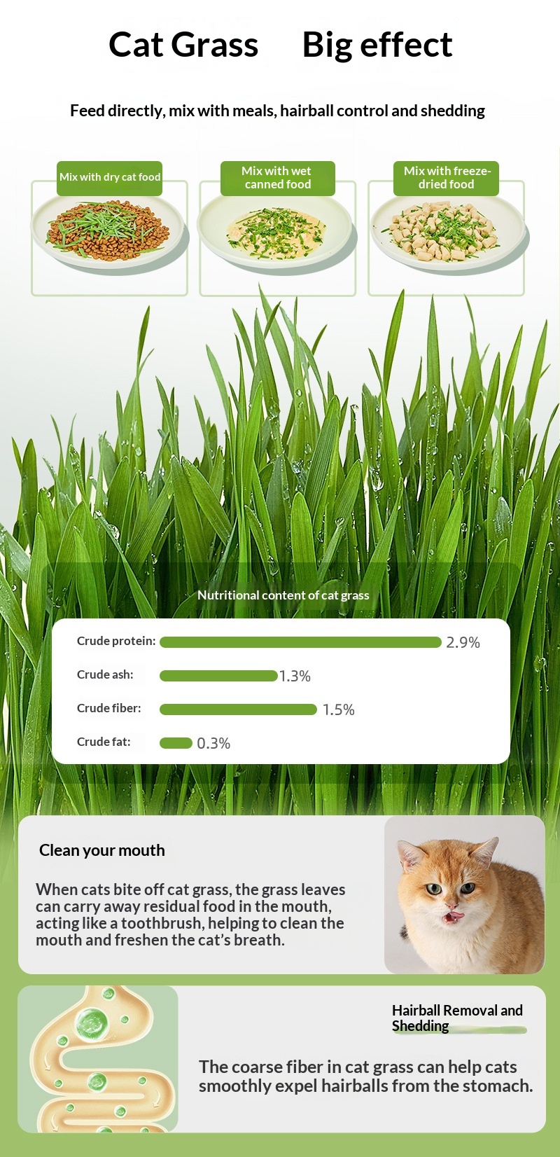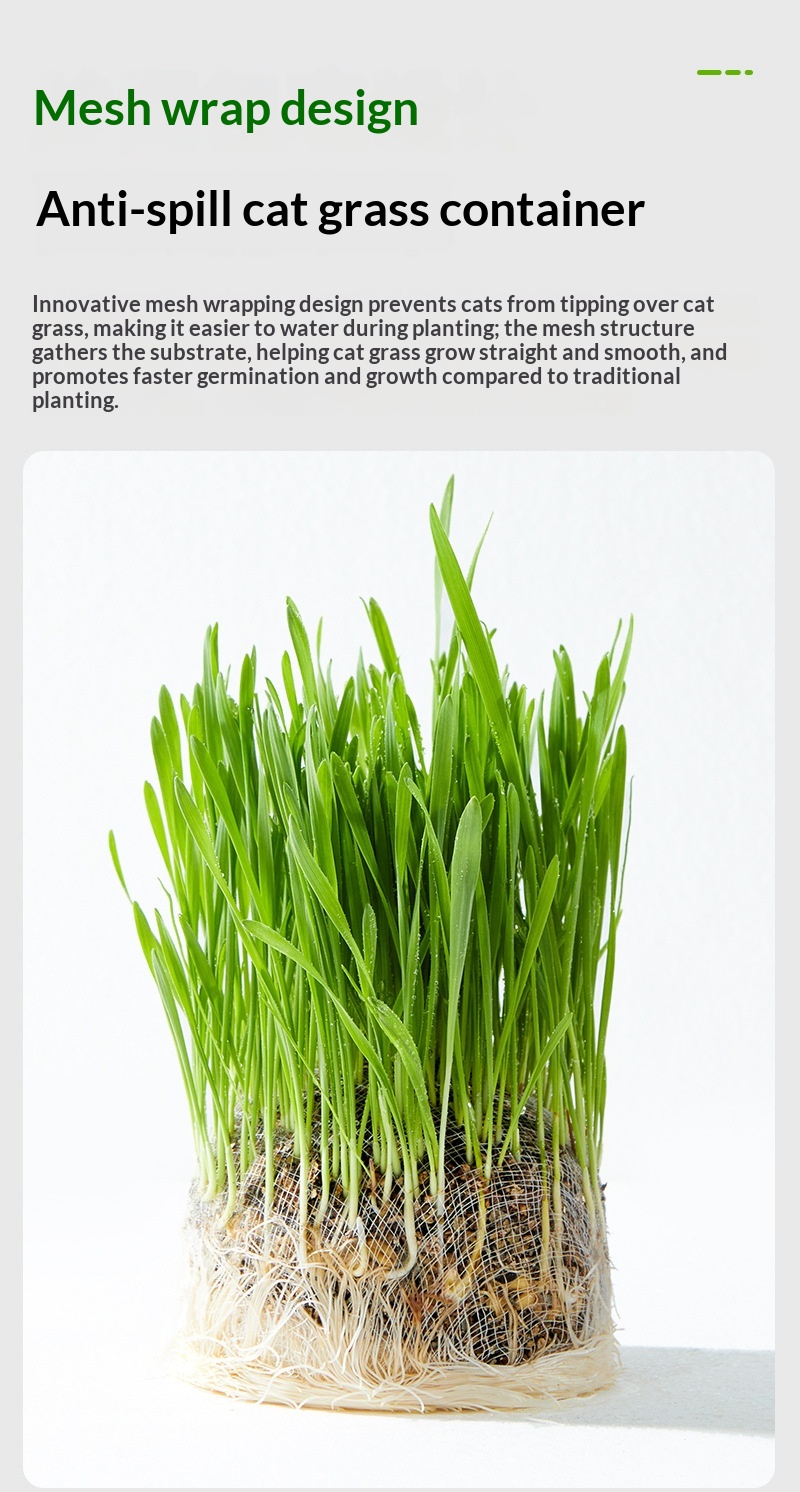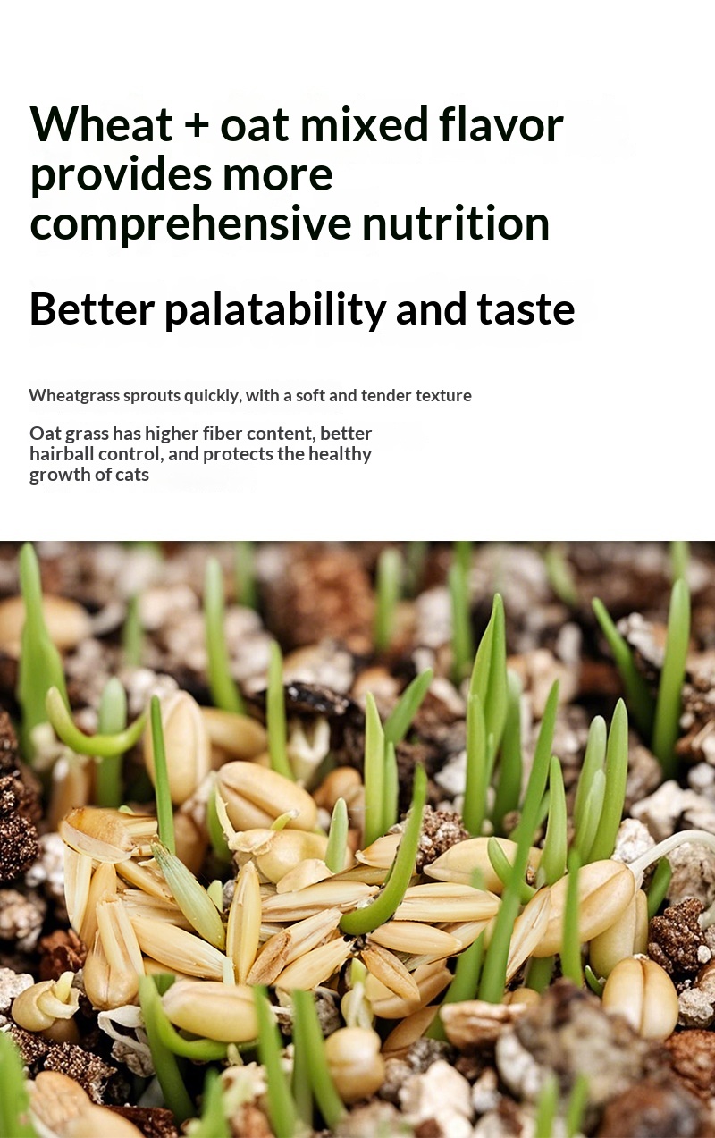This soil-free cat grass snack mix is specially formulated for cats, offering natural nutrition and a satisfying chew that helps support digestion and reduce hairballs. Available in multiple package sizes to meet different feeding needs.