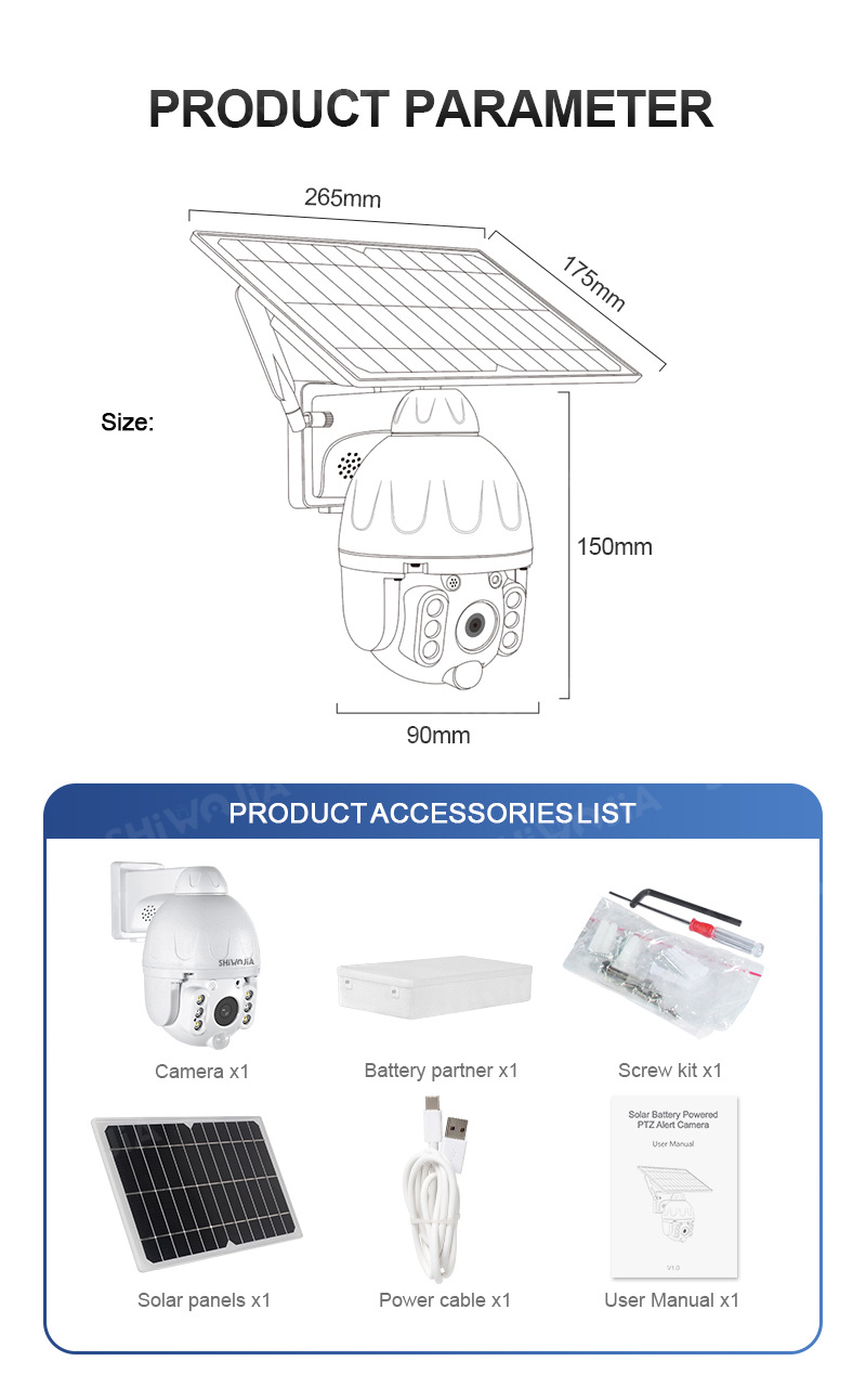 Dome Solar Camera x1 Solar panel*1 Data cable*1 Several accessories