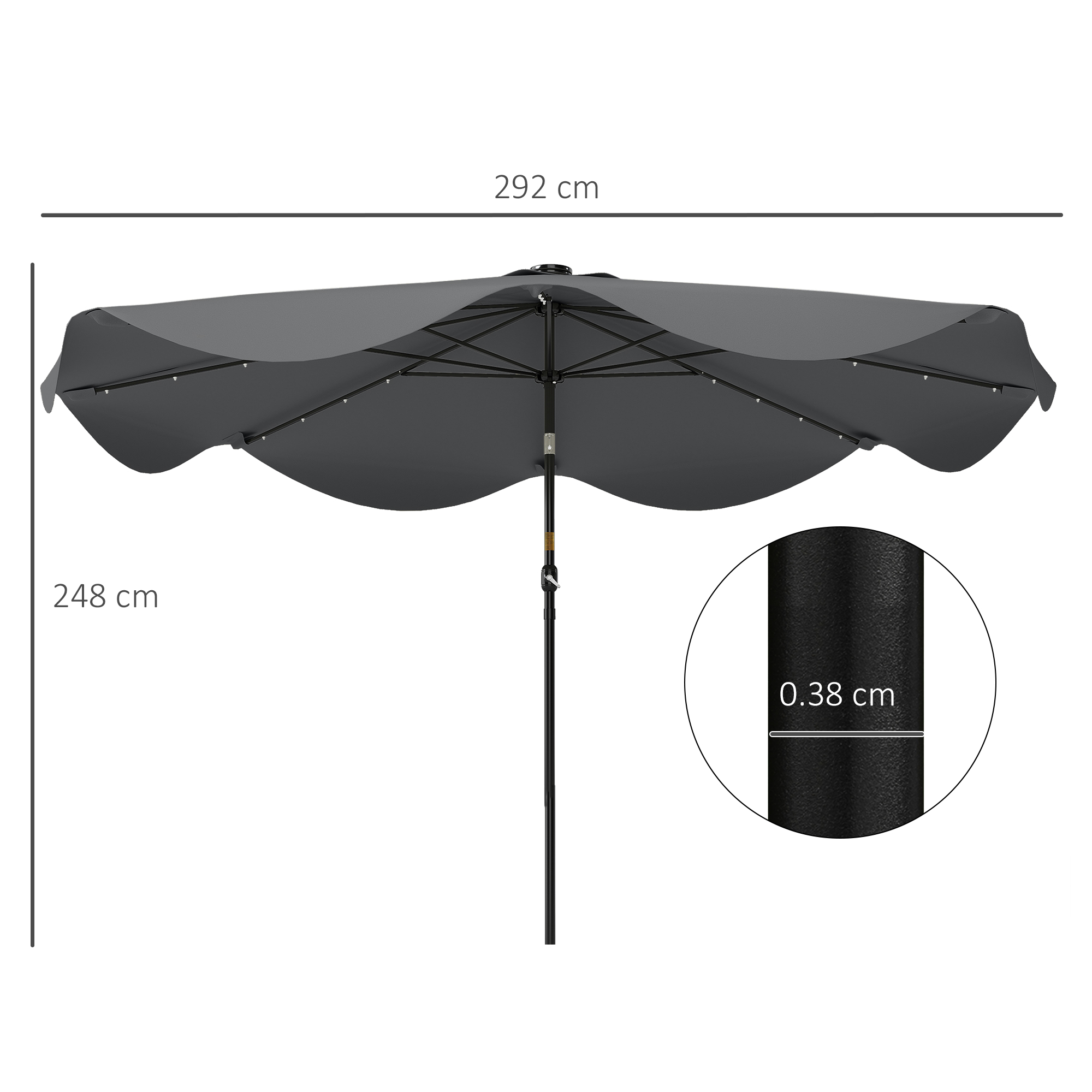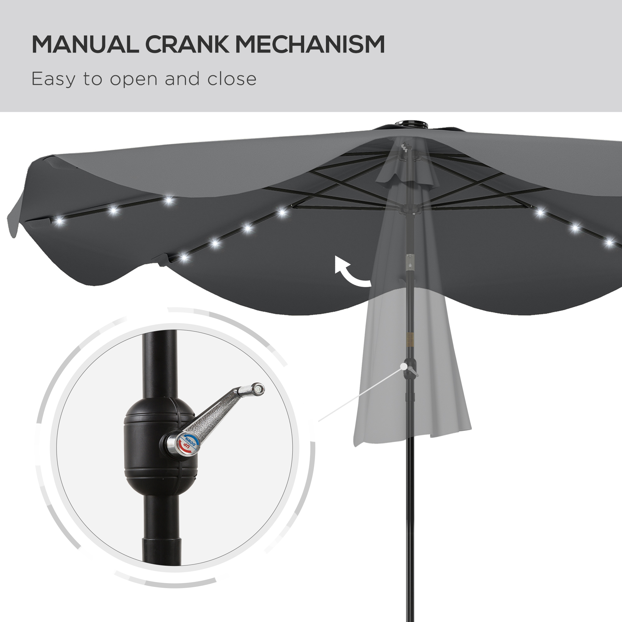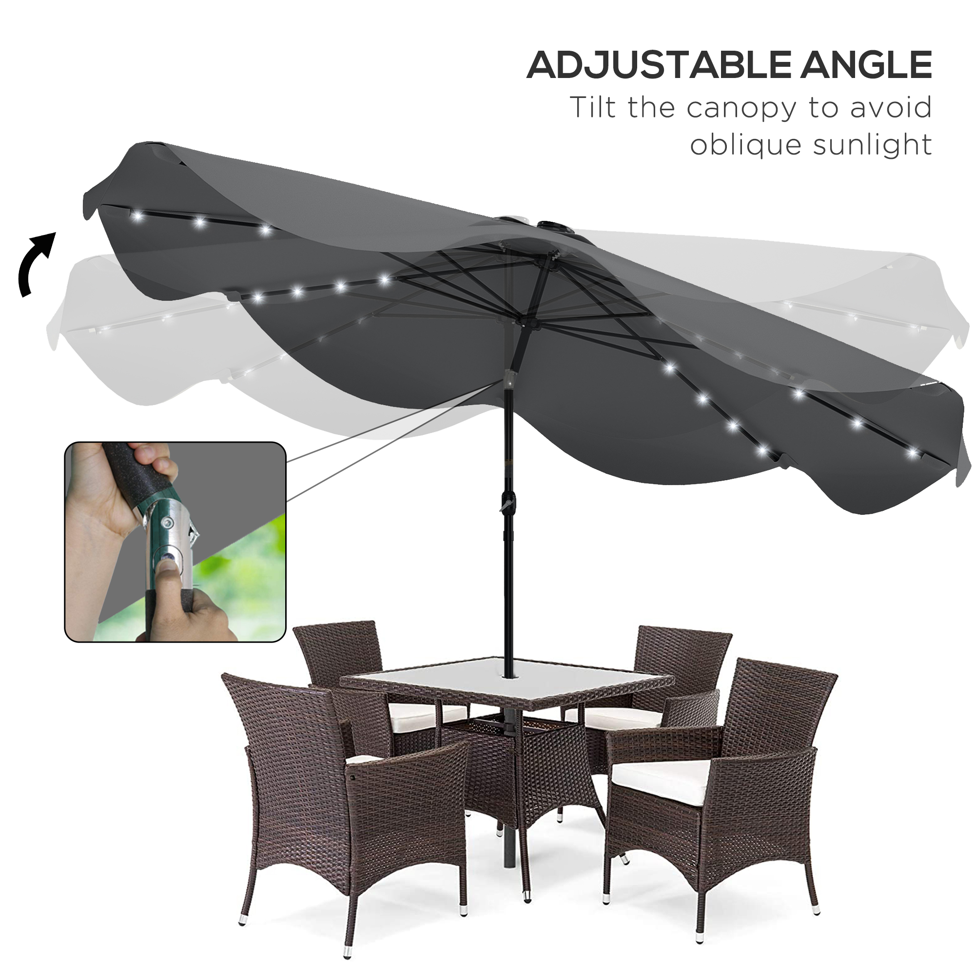 Light up the night with a summertime essential. Not just a parasol umbrella, this is an parasol umbrella with lights. All eight ribs are fitted with solar-powered LEDs: they charge in the sunlight to power up when dark - extend your outdoor leisure time easily. The canopy can be tilted to a maximum 45° angle either way which blocks light in different directions. Use the crank handle to open and close the canopy easily. Use a base to stand upright and steady day and night.