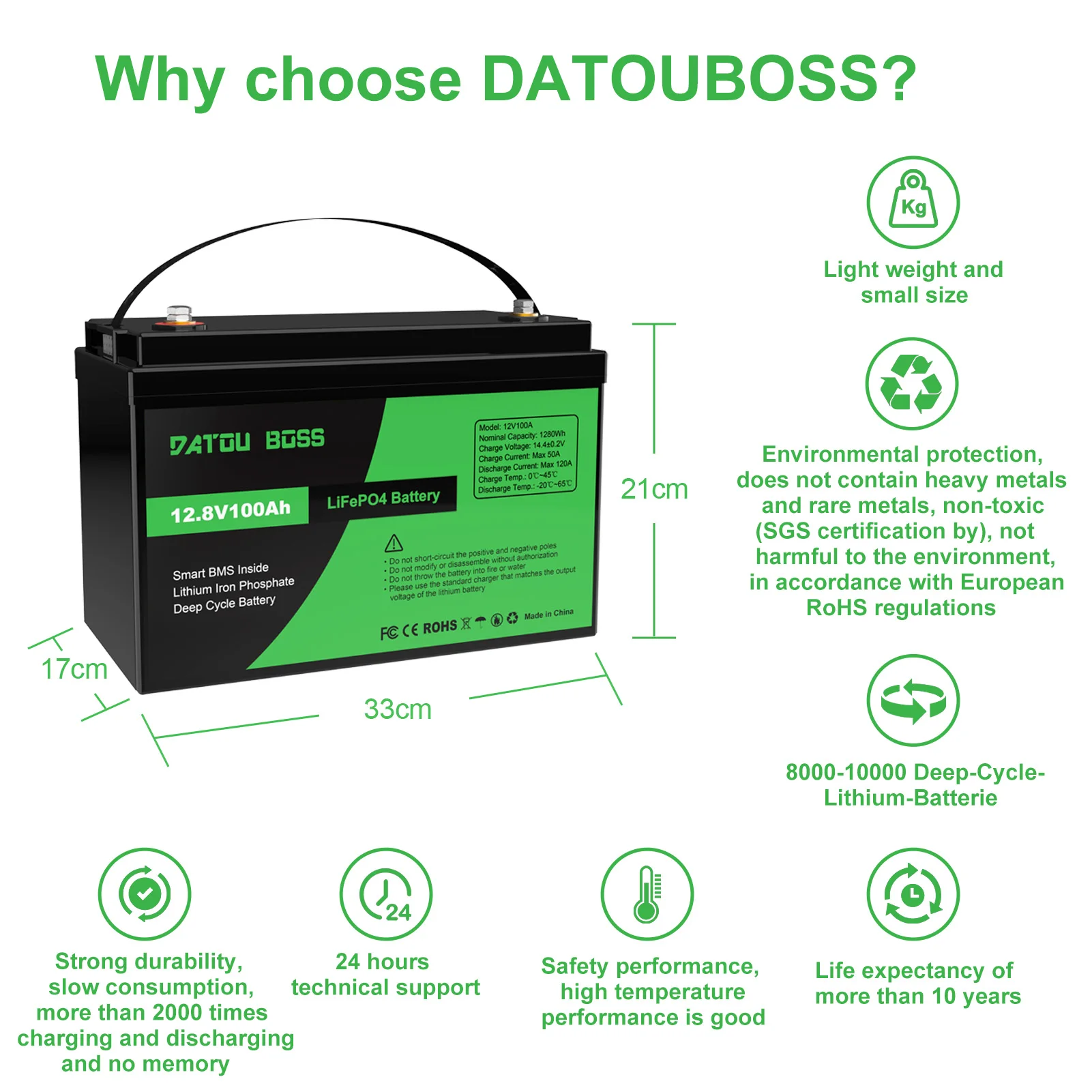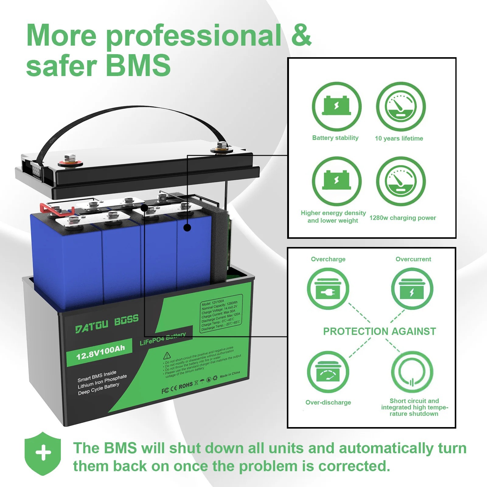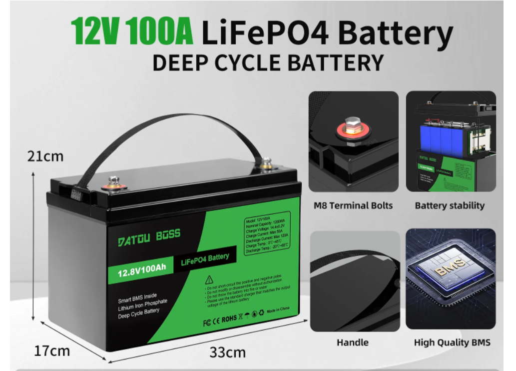 Product information:NOMINAL VOLTAGE:12.8VBMS:120ATERMINAL: M8NUMBER OF CYCLES: 10000WEIGHT: 10.92KG