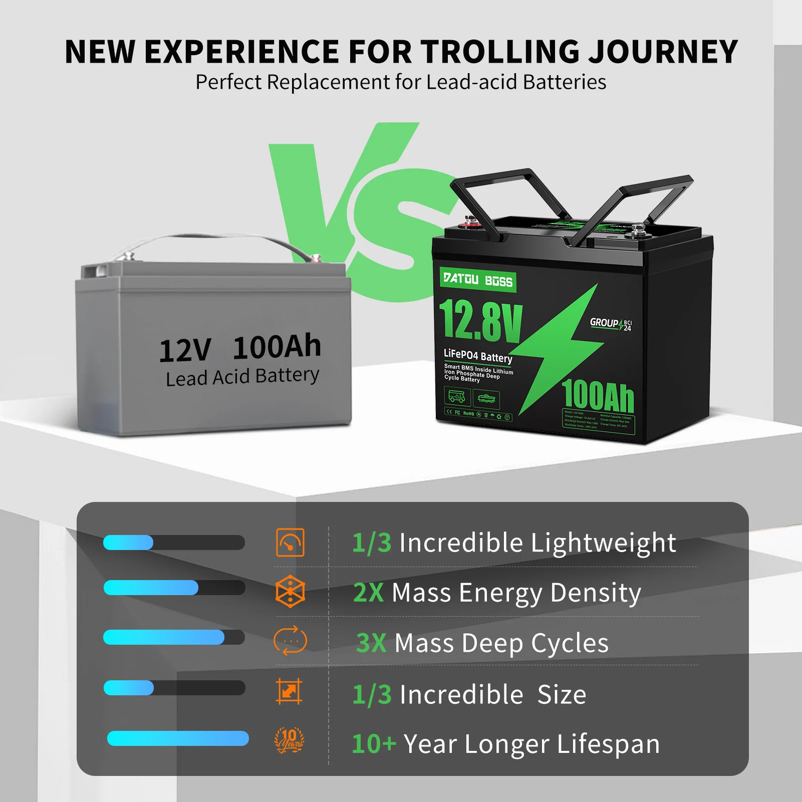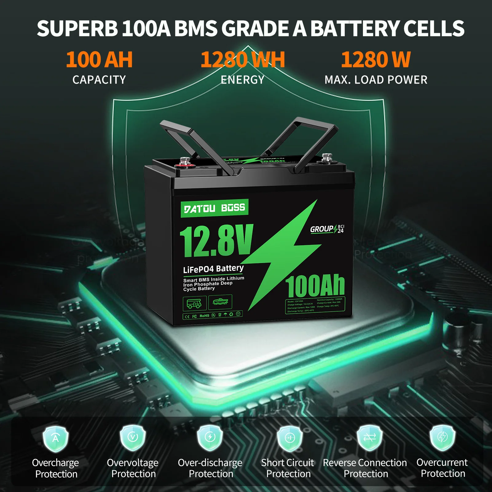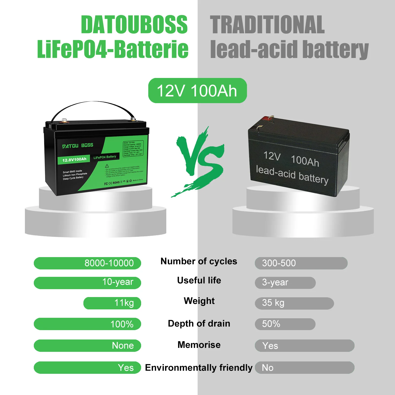 Product information:NOMINAL VOLTAGE:12.8VBMS:120ATERMINAL: M8NUMBER OF CYCLES: 10000WEIGHT: 10.92KG