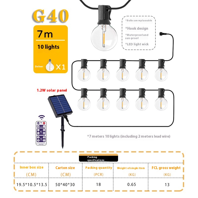 Specifications: 7 m 10 lamp G40-filament and bulb, 10 m 20 lamp G40-filament and bulb, 9.5m 25 lamp G40-filament and bulb, 15 m 30 lamp G40-filament and bulb, 7 m 10 lamp G40LED lamp beads, 10 m 20 lamp G40LED lamp beads, 15 m 30 lamp G40LED lamp beads, 10 m 20 lamp G40-copper wire lamp bulb, 15 m 30 lamp G40-copper wire lamp bulb