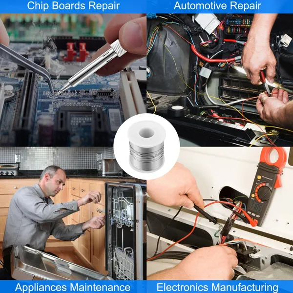 *High Quality Soldering Wire*:The .03’’/0.8mm in diameter wire contains 60% Tin and 40% Lead with 1.7% activity rosin flux core features uniform heating and good flow ability. *Excellent Performance*:Its excellent electrical conductivity and thermal conductivity is good for electrical repair. Our solder wire creates less smoke and rosin splash while soldering and provides bright,smooth and sturdy welding spot. Moreover,fewer residues left after soldering. *Lower Melting Point*:Lower melting point(range of 361°F-374°F/183°C-190°C) makes soldering quickly and efficiently. *Easy to Use and Carry*:Comes with a solder wire reel,which is convenient for soldering use and storage. Its compact and lightweight body makes it easy to carry everywhere. *Wide Application*:Great for both DIY enthusiasts and professional electrician when doing home improvement,repairing cables/ circuit boards/radios/TVs/stereos/headsets and other electrical devices. *Specifications*: