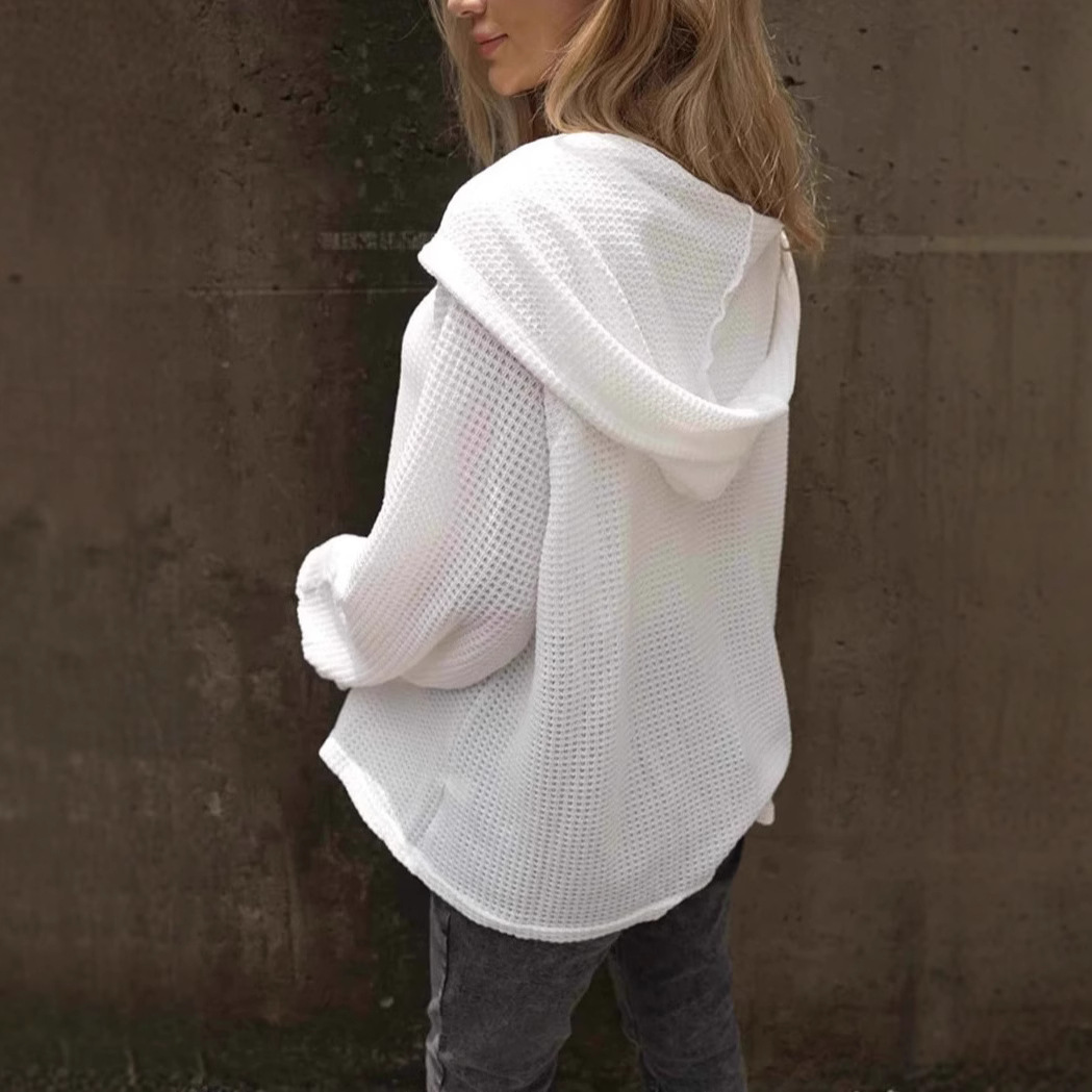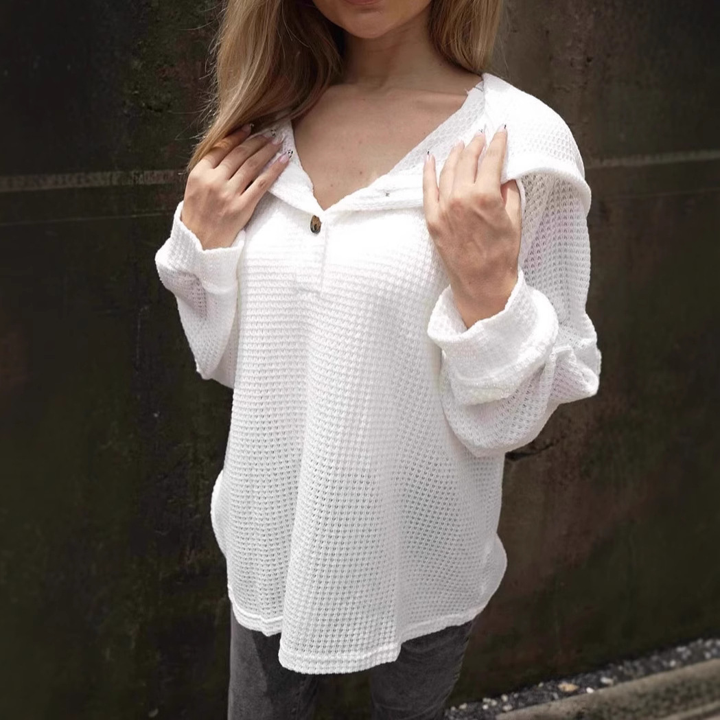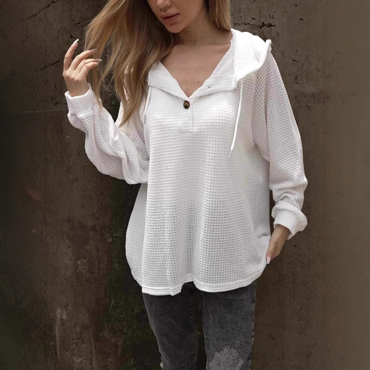 Solid Color Buttons Hoodie With Drawstrings V-neck Casual Loose Long Sleeve Sweatershirt