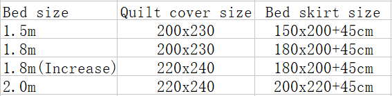 Size specification 1.5m (5 feet) bed, 1.8m (6 feet) bed, 1.8m bed quilt enlarged, 2.0m (6.6 feet) bed (cm)