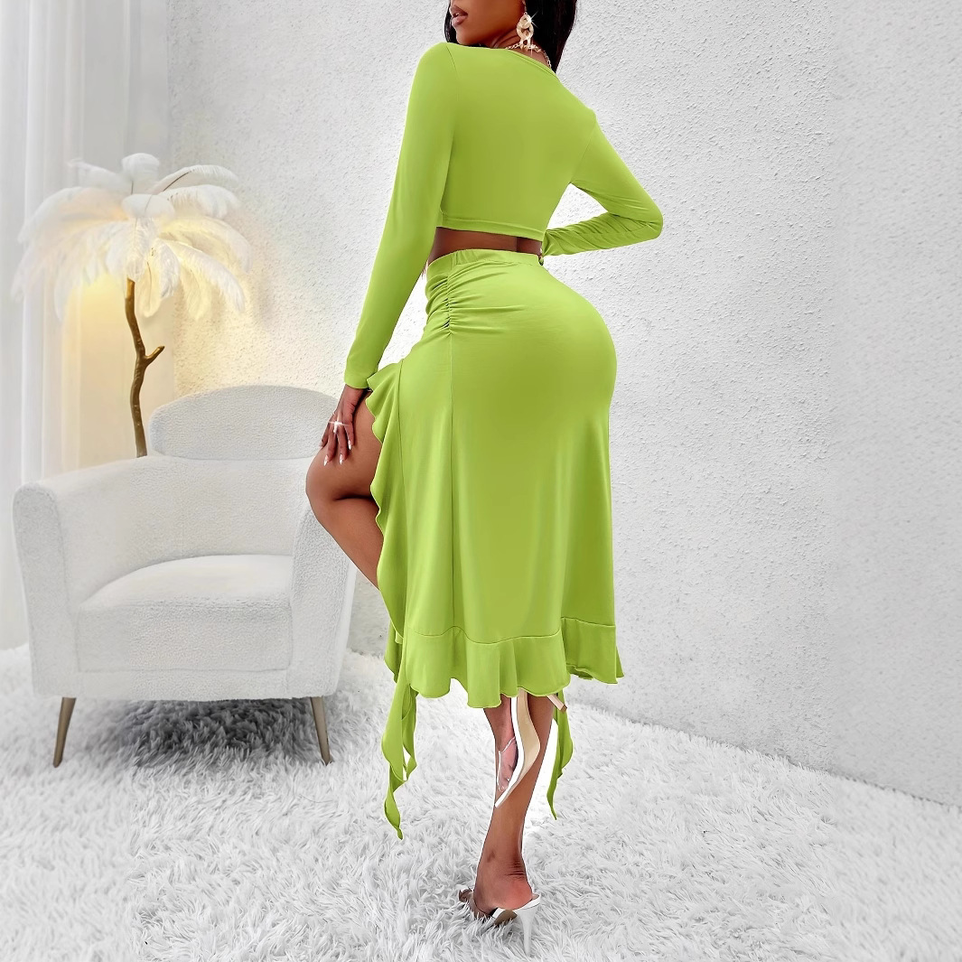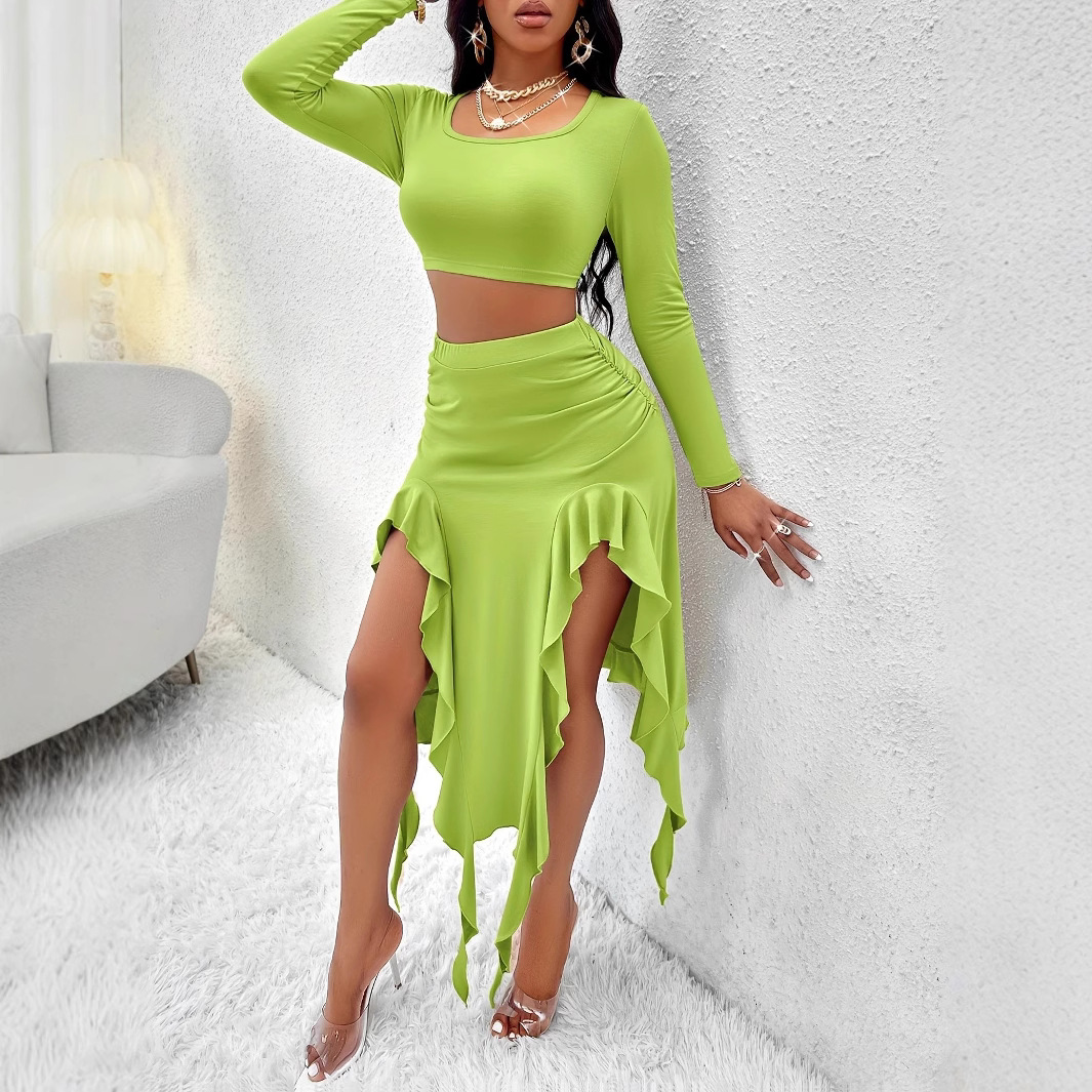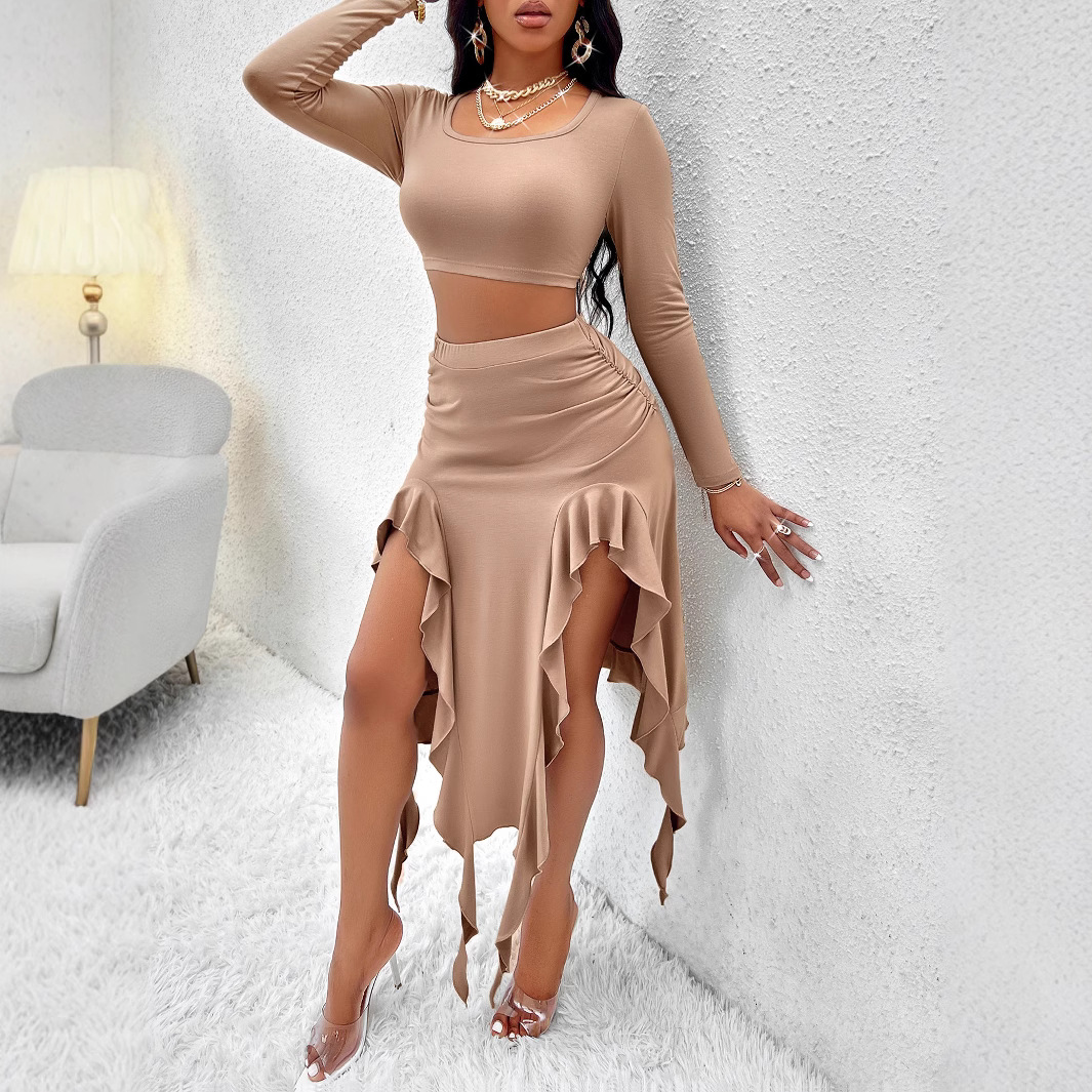 Solid-color Crewneck Long-sleeve Top And Ruffled Hem Midi Skirt Set