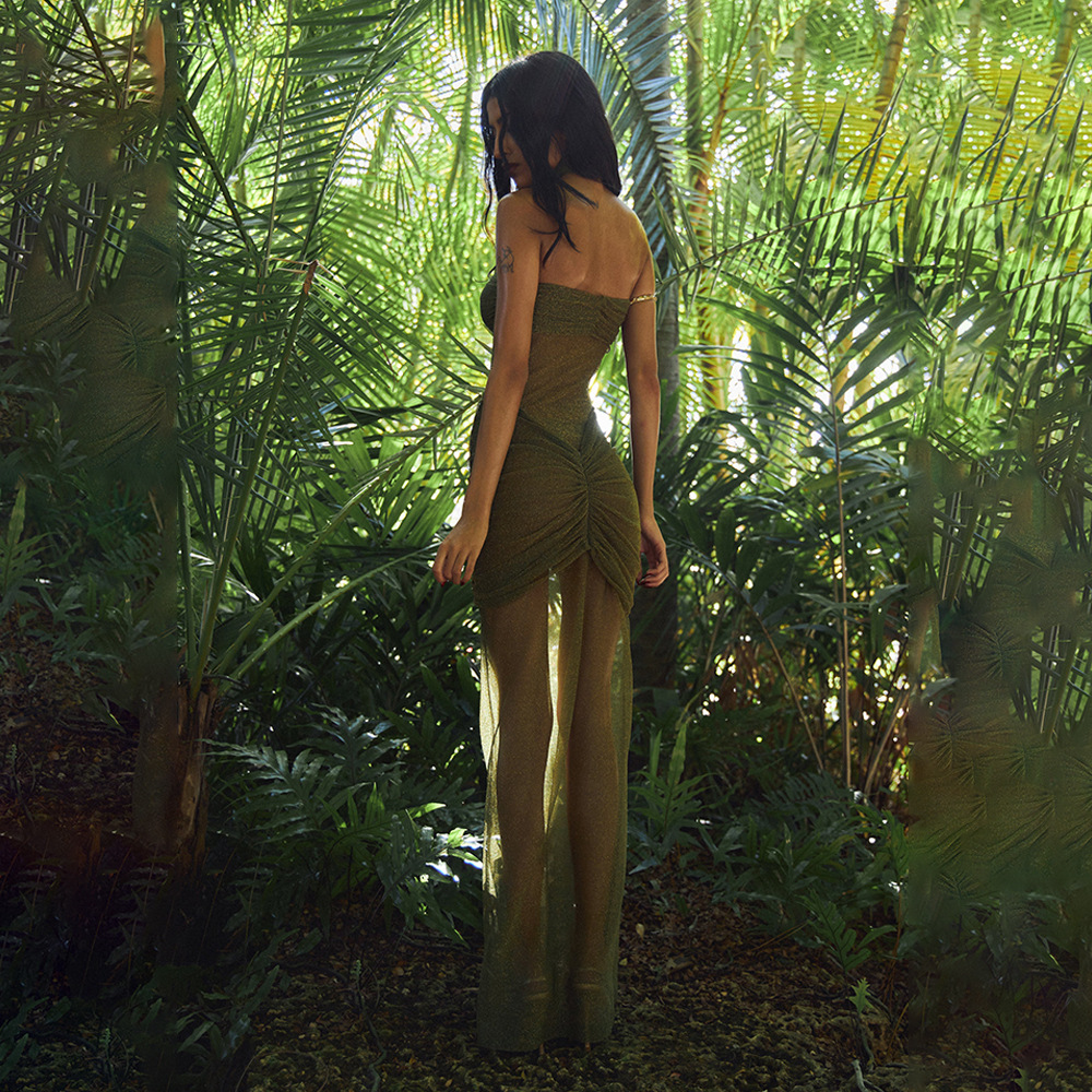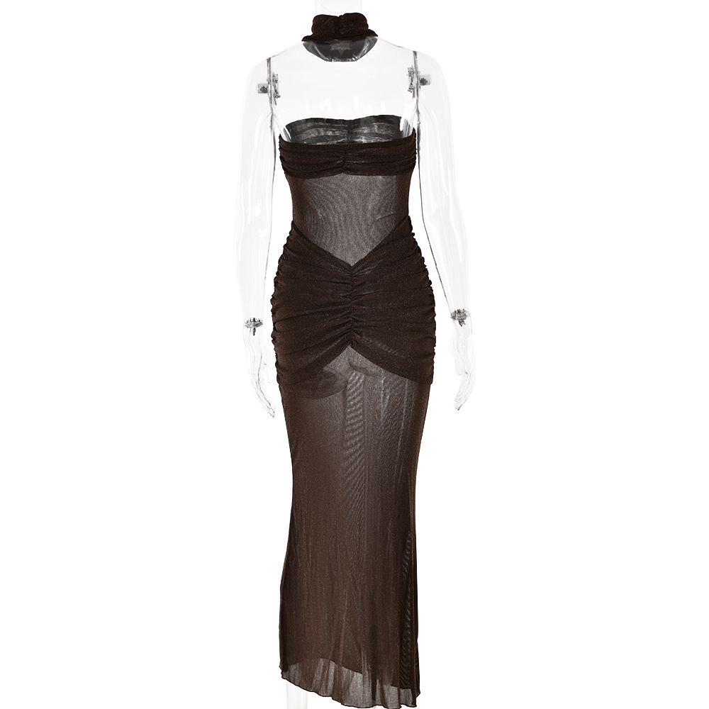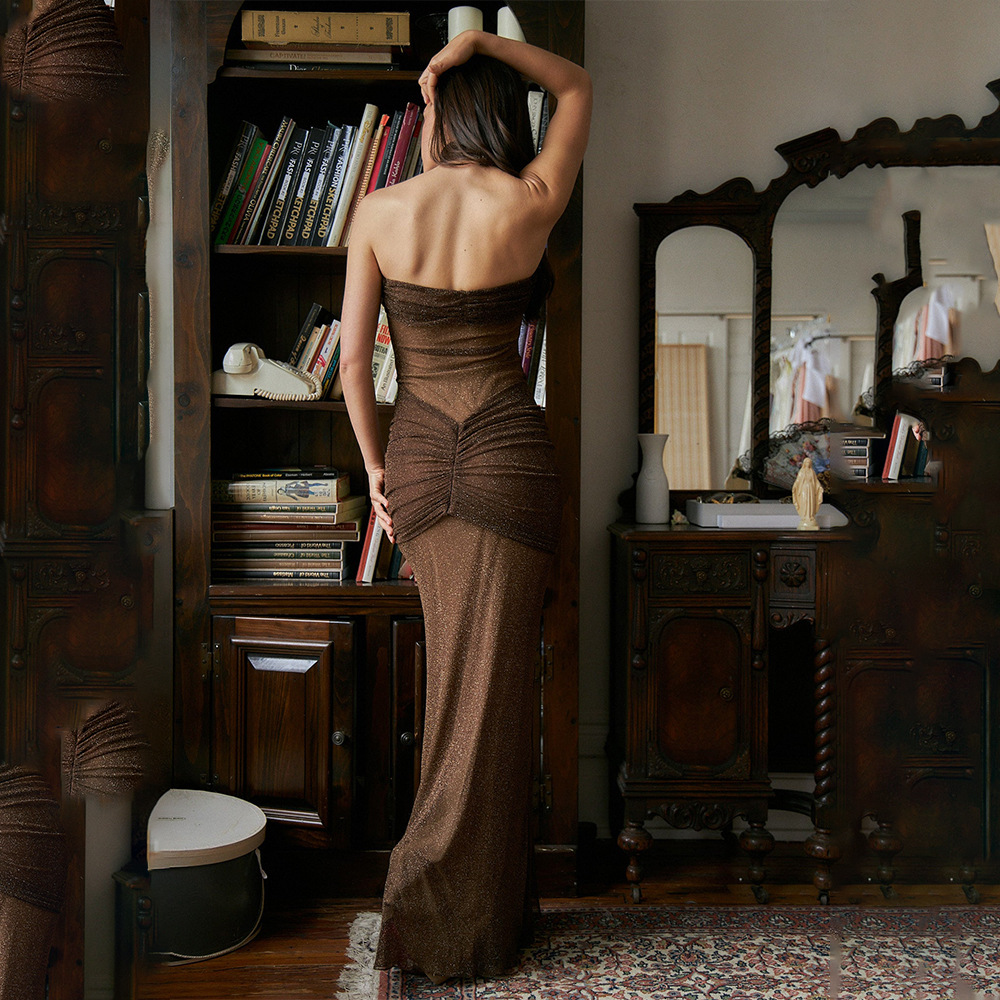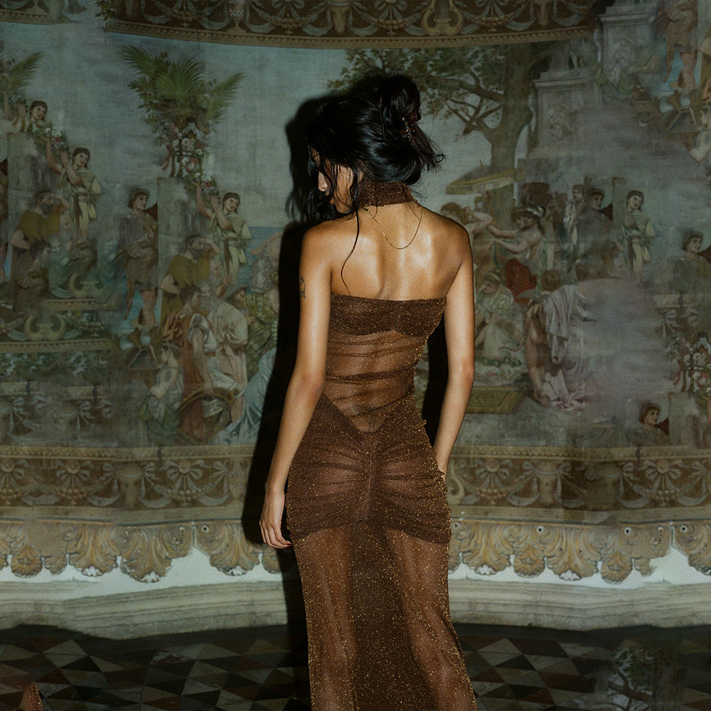 Color: brown, black, green, knitted silver string fabric, see-through bright silk design