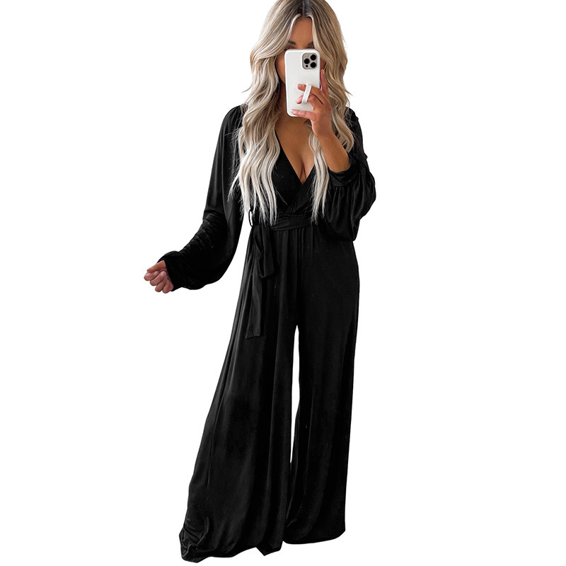 Solid Color Lace-up Wide Leg Deep V-neck Jumpsuit