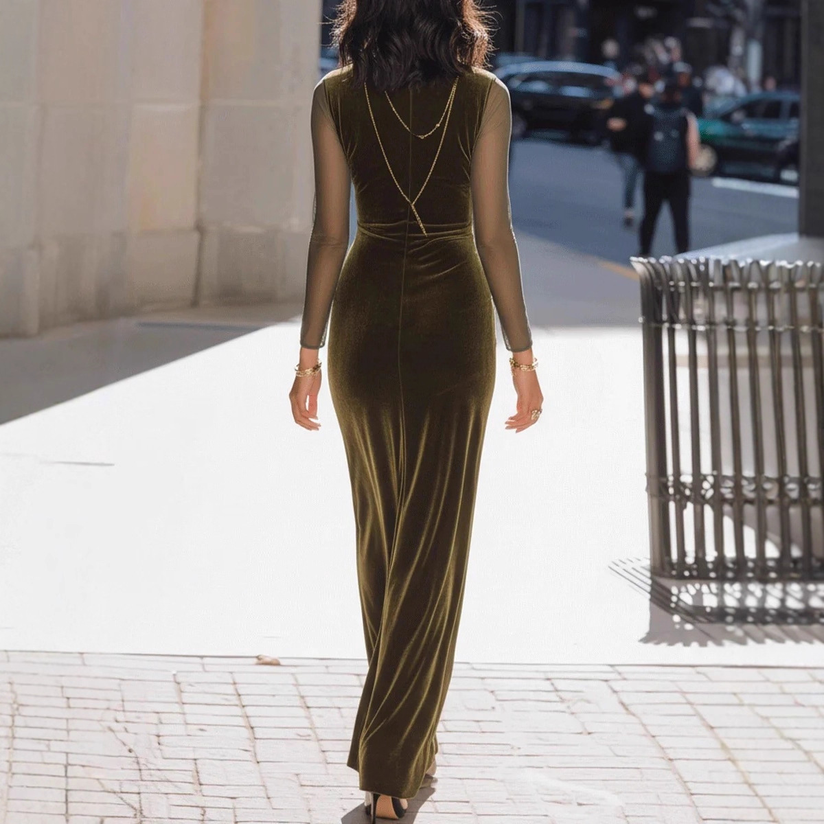 Solid-color Long A-line Skirt With A Mesh Fabric And Round-neck Pullover Design