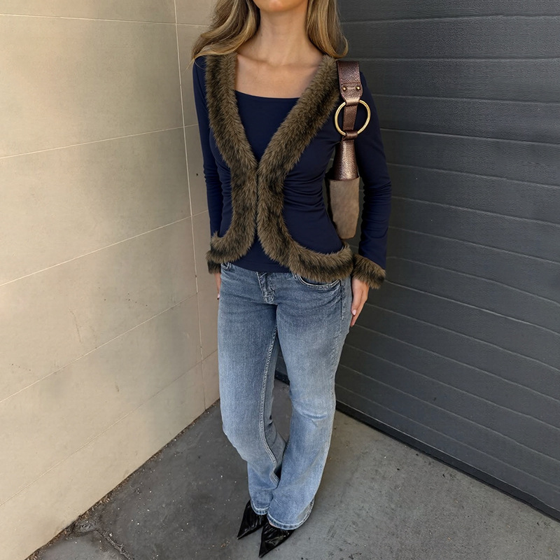 Solid-color Long-sleeve Plush Patchwork Top