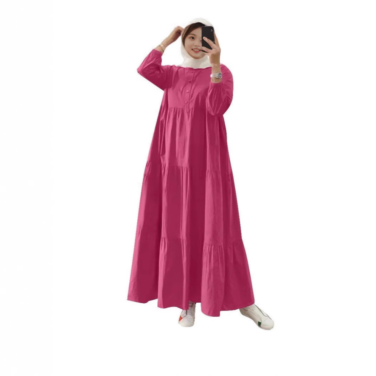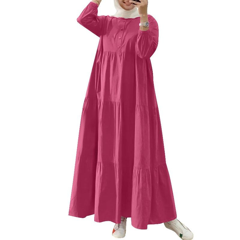 Solid-color Loose-fit Casual Button-neck Long-sleeve Milk Silk Dress
