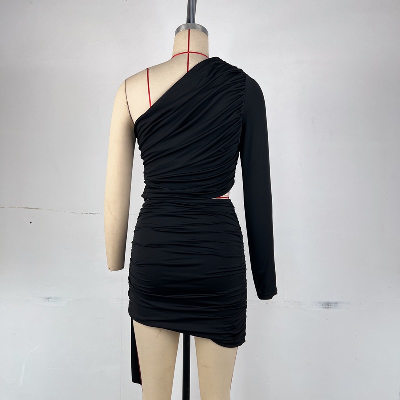 Solid-color Patchwork One-shoulder Sleeve Pleated Bodycon Mini Skirt Two-piece Set