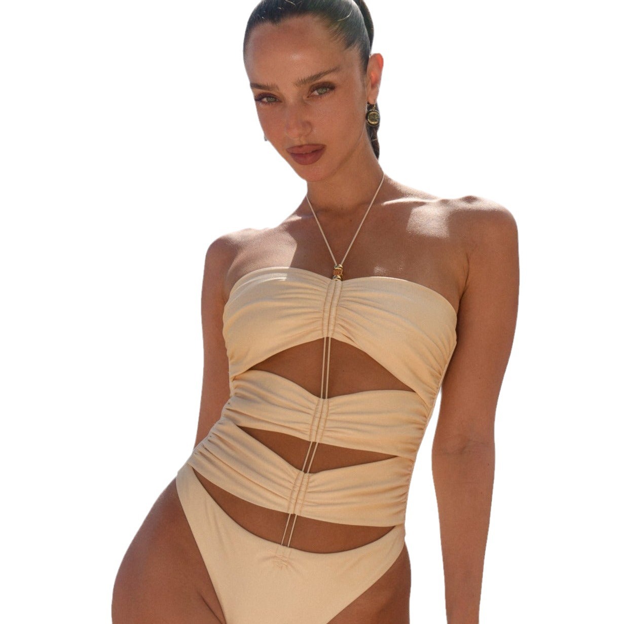 Solid Color Pleated One-piece Swimsuit Women's Lace-up Tight