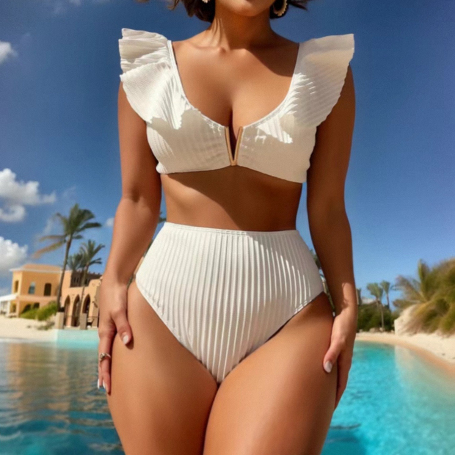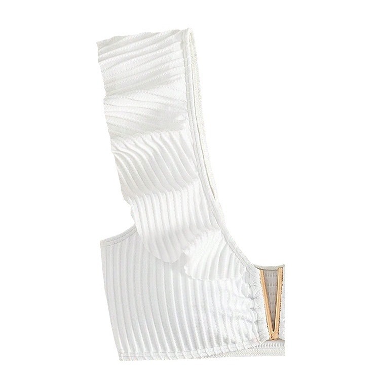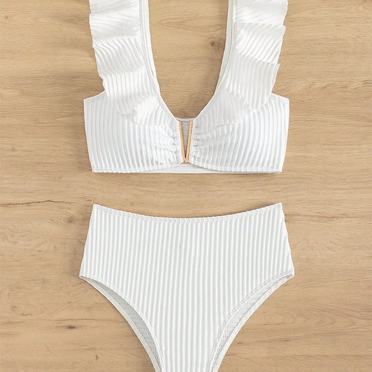 Solid Color Rib Fabric Ruffled Bikini