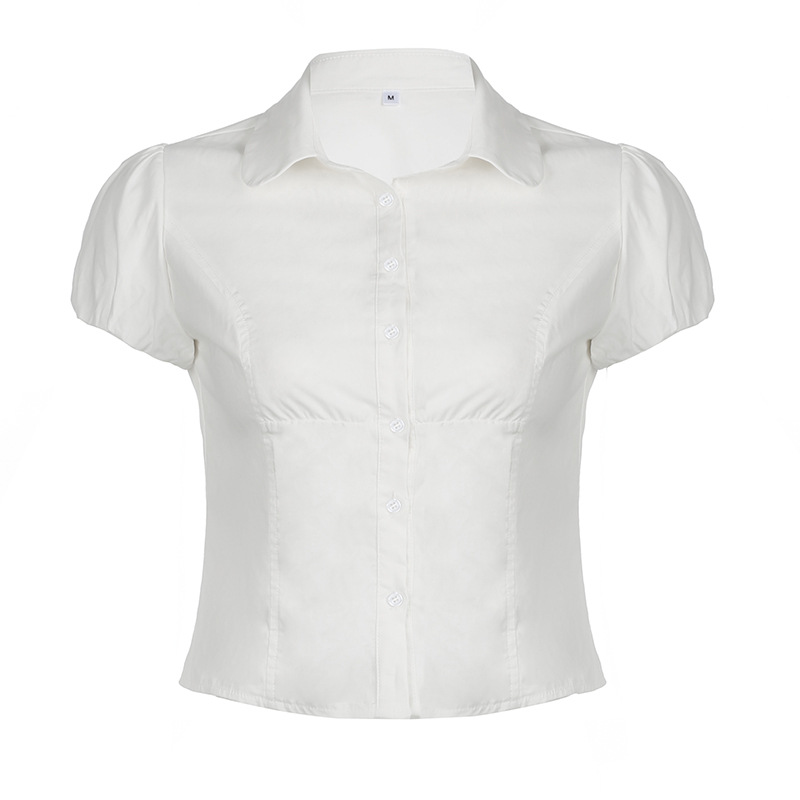 Solid Color Simple Waist Fitted Puff Sleeve Polo Shirt