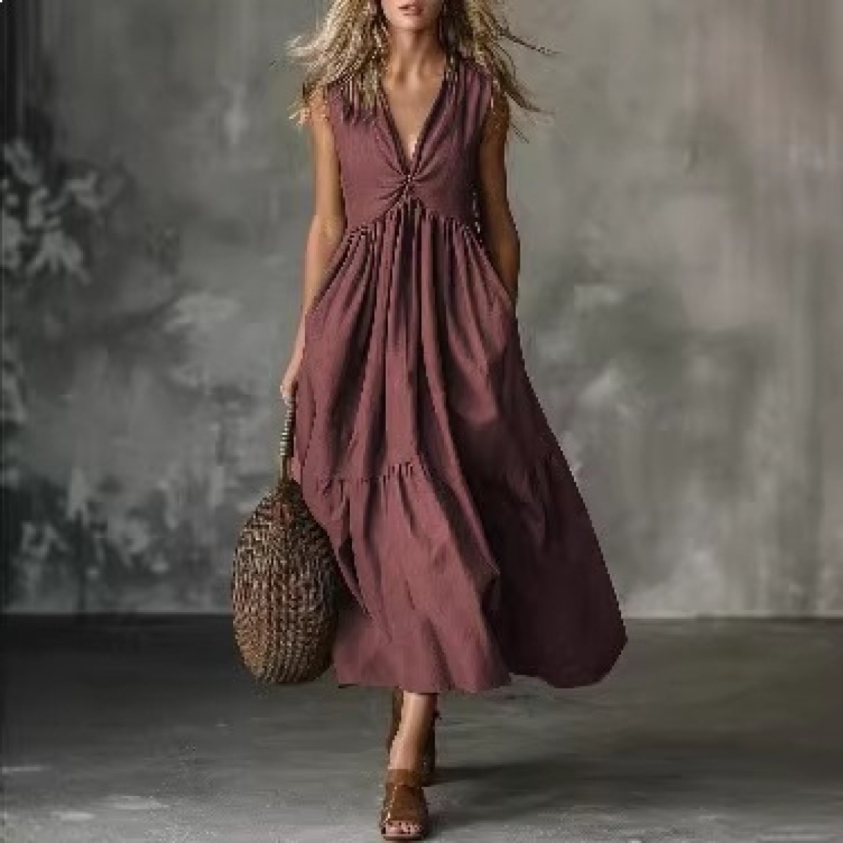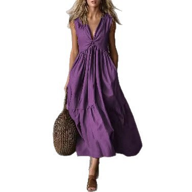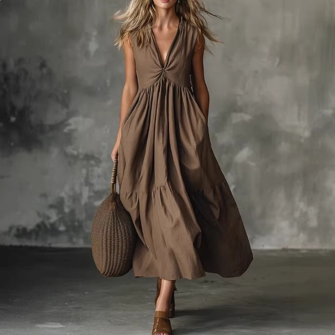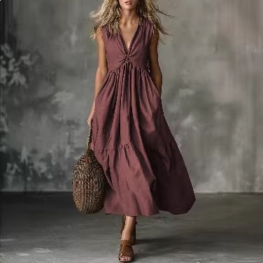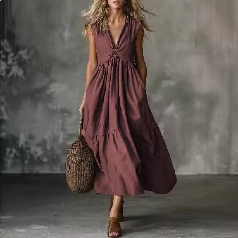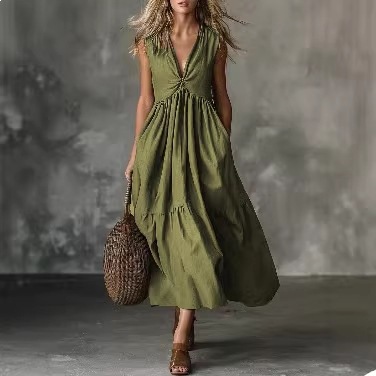 Solid-color Sleeveless V-neck Dress