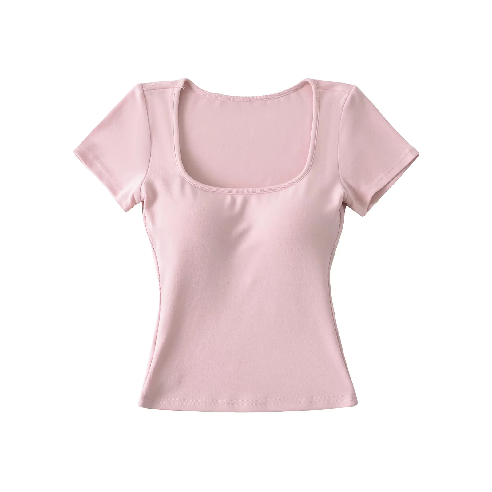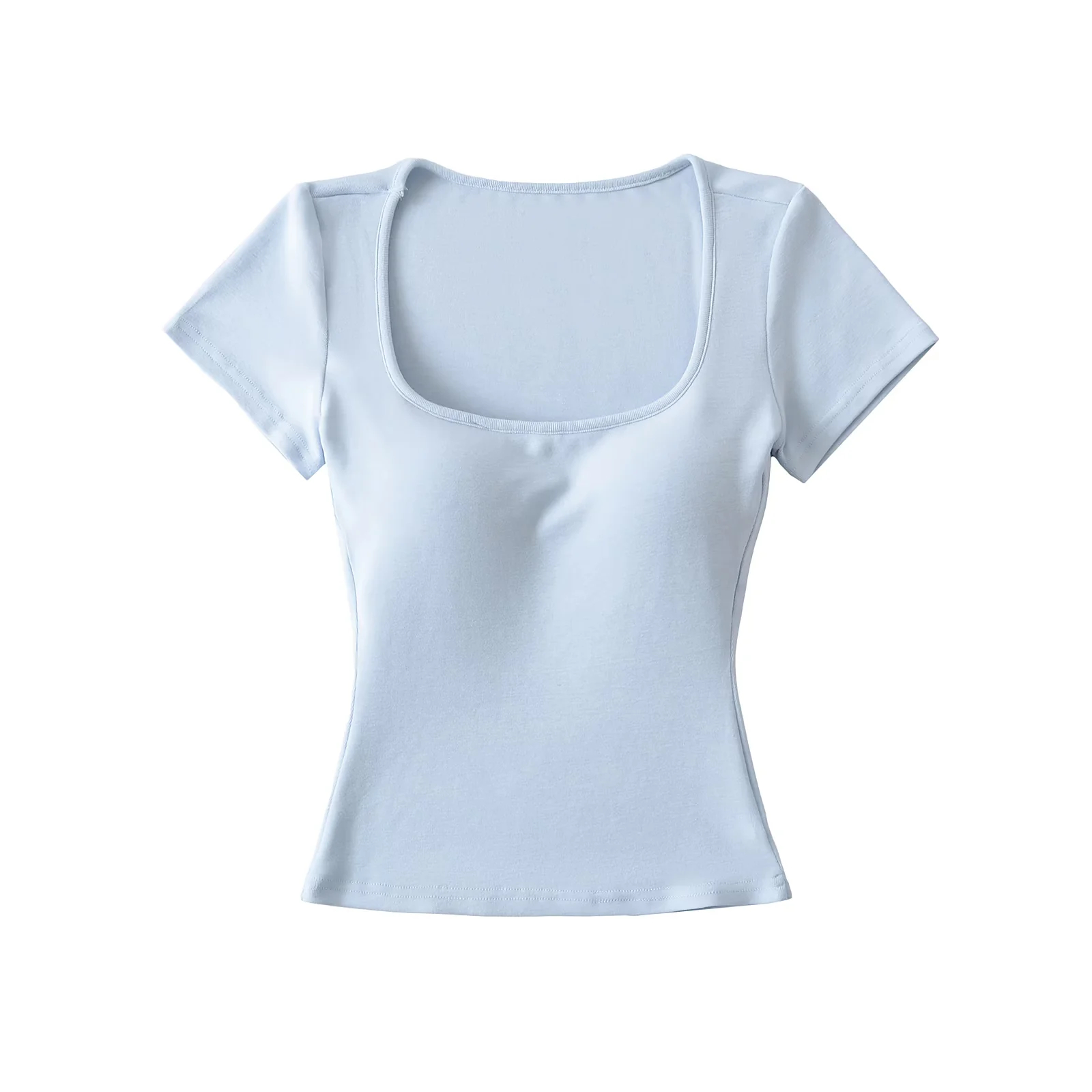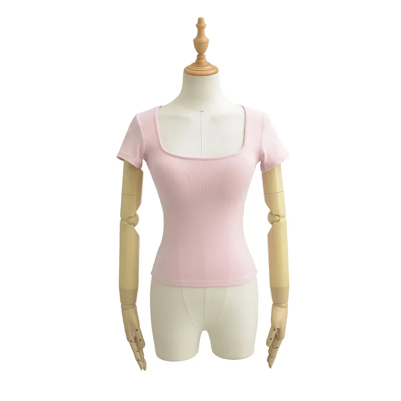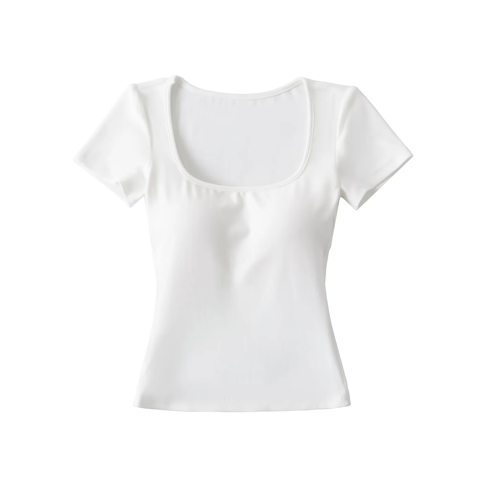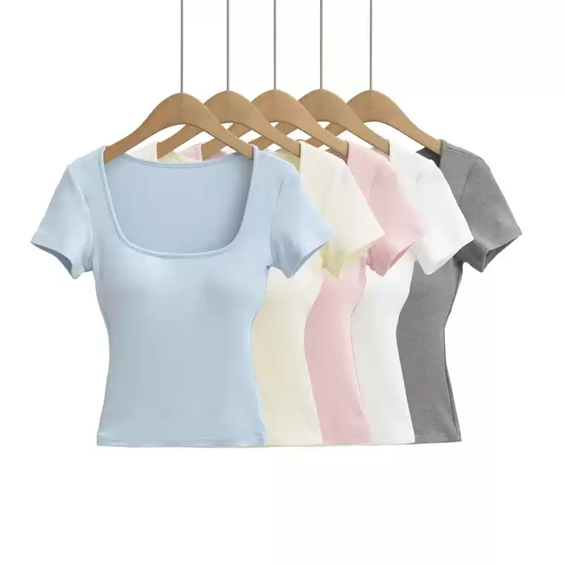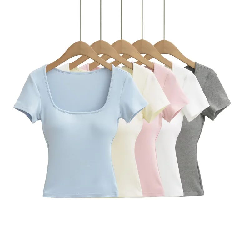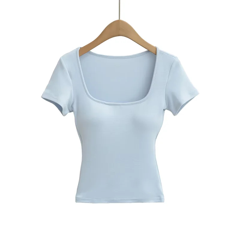 Solid-color Square-neck Short-sleeve T-shirt With Chest Pads