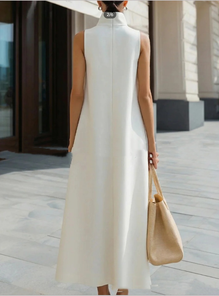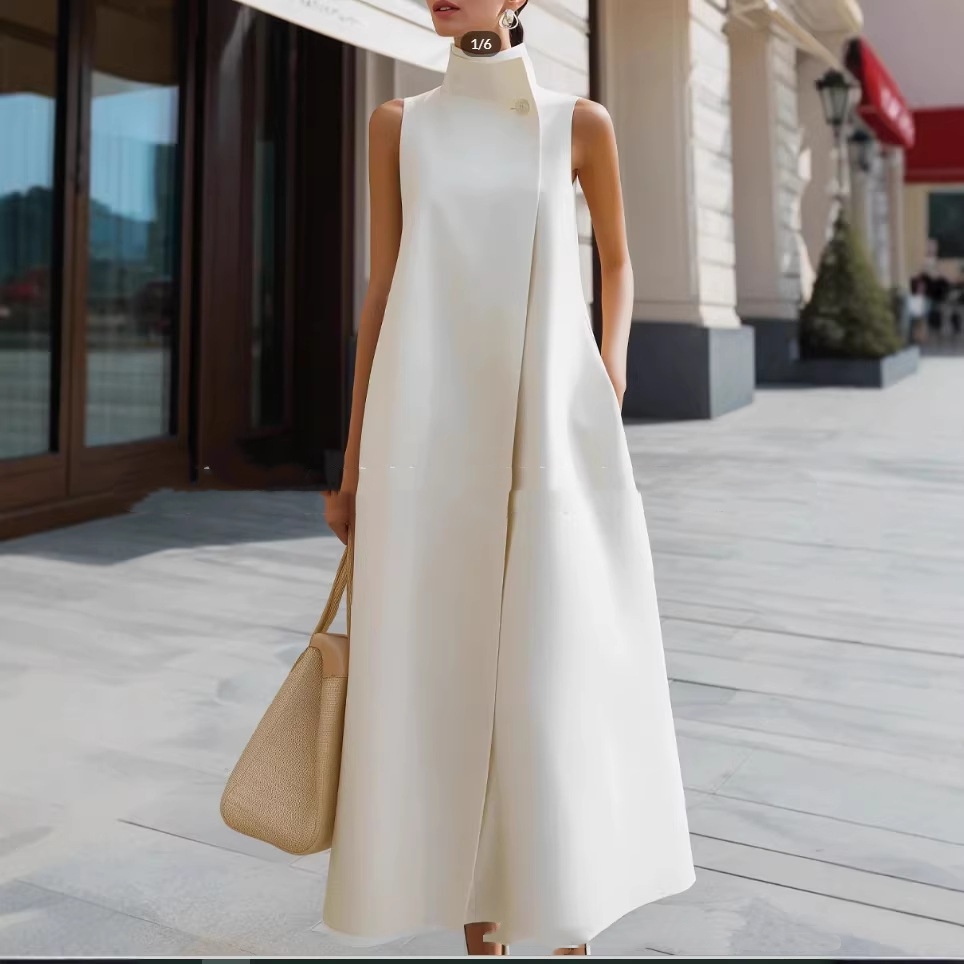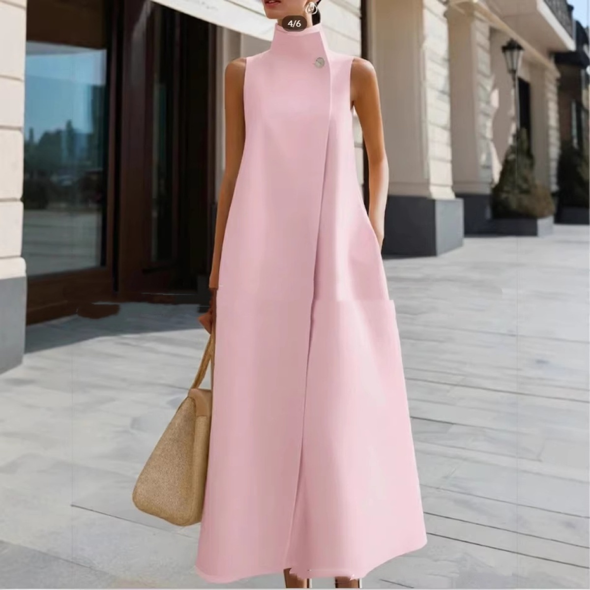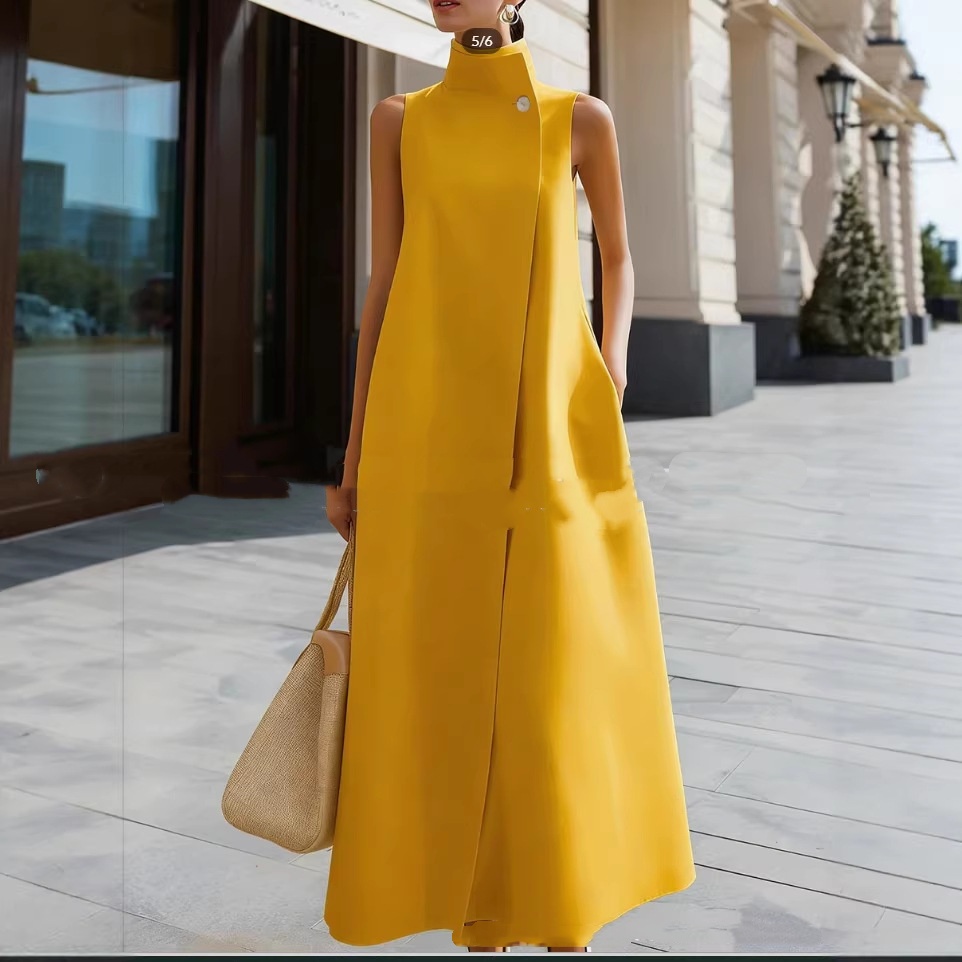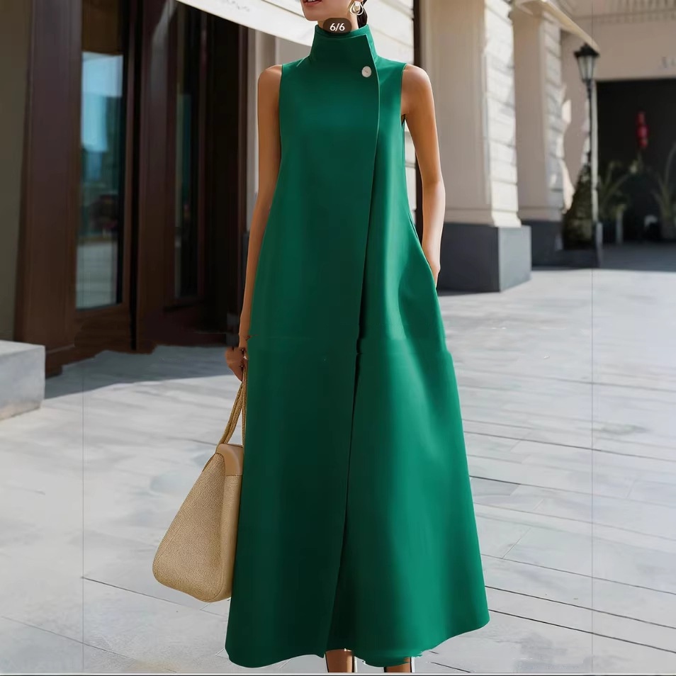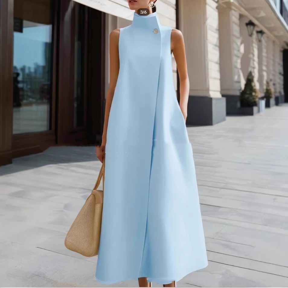 Solid-color Stand-up Collar Sleeveless Loose Cotton Dress