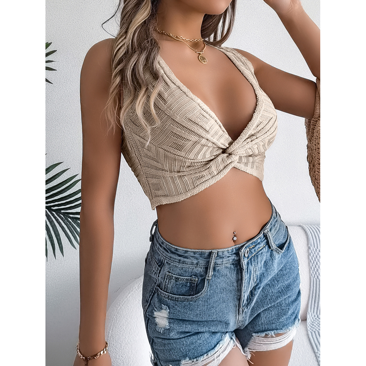 Solid Color Tie Front Knit Crop Top - Vacation Blouse
