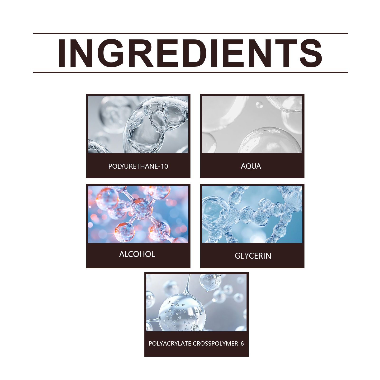 Product information:Ingredient: Polyurethane -10 water ethanol glycerol polyacrylate cross-linked polymer -6