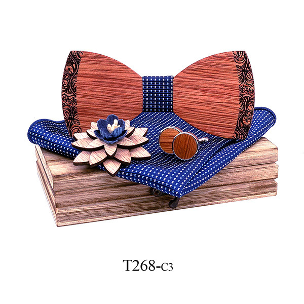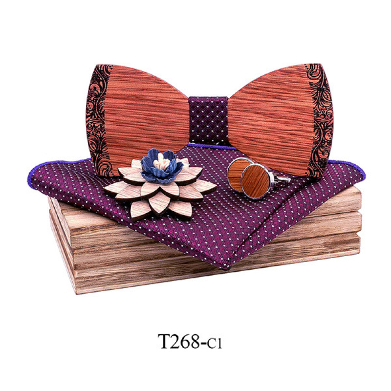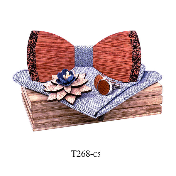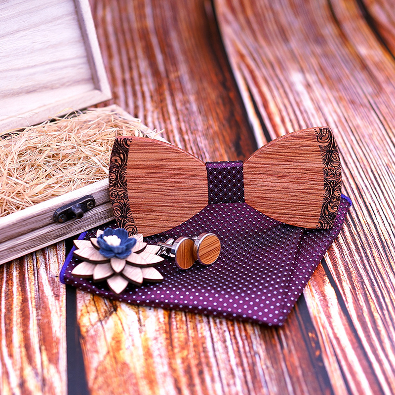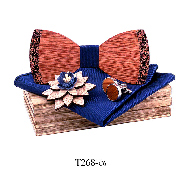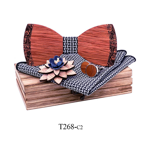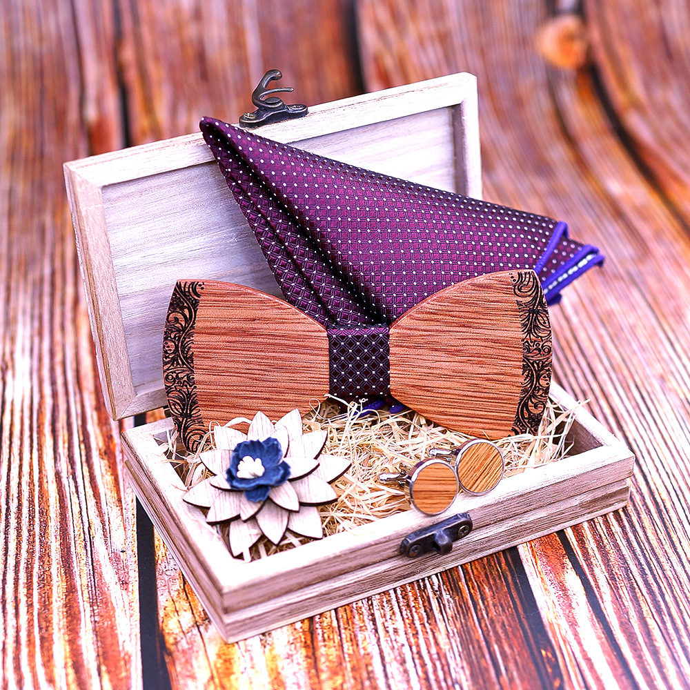 bow tie, cufflinks, square scarf, wooden box, corsage