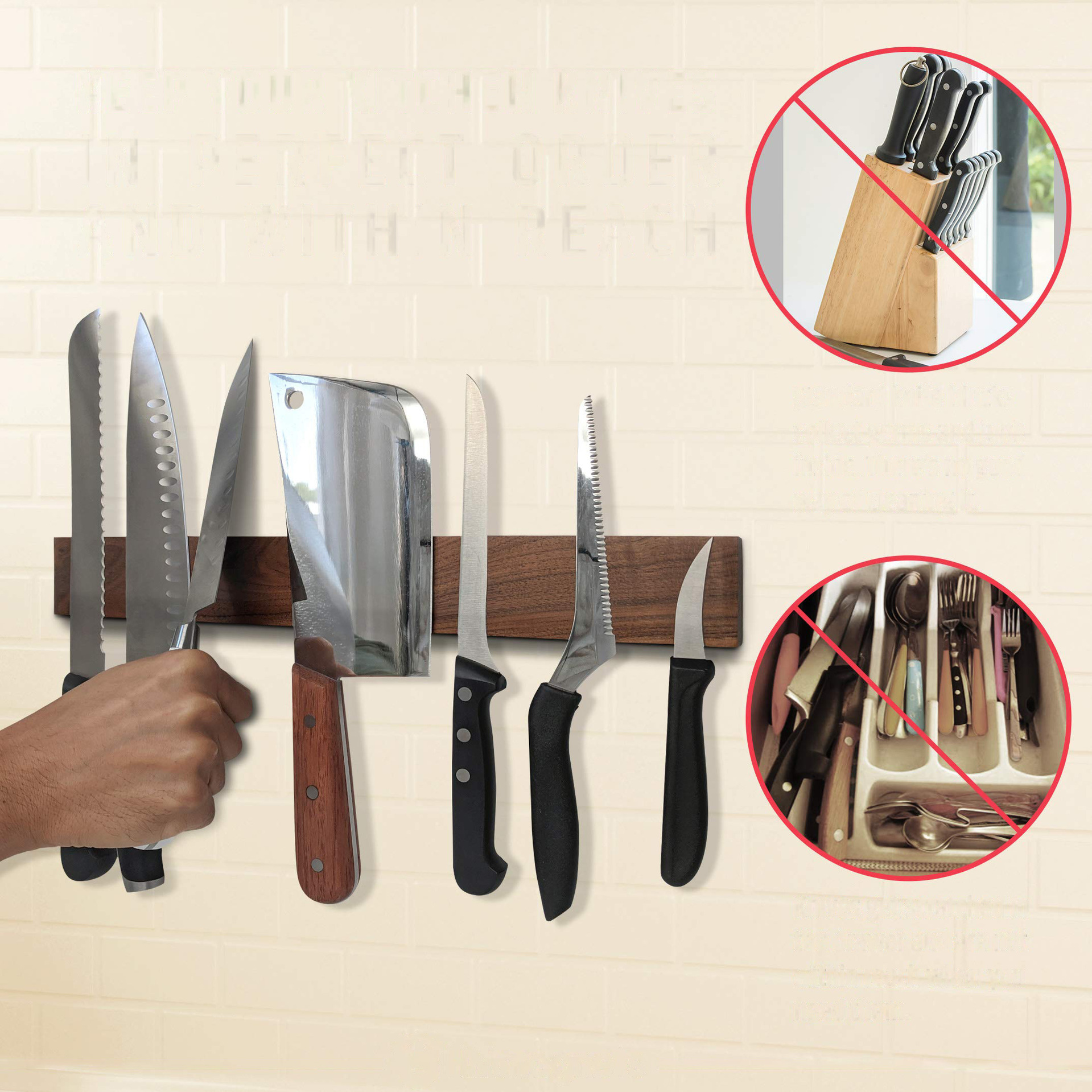 Solid Wood Non Perforated Wall Mounted Magnetic Knife Holder