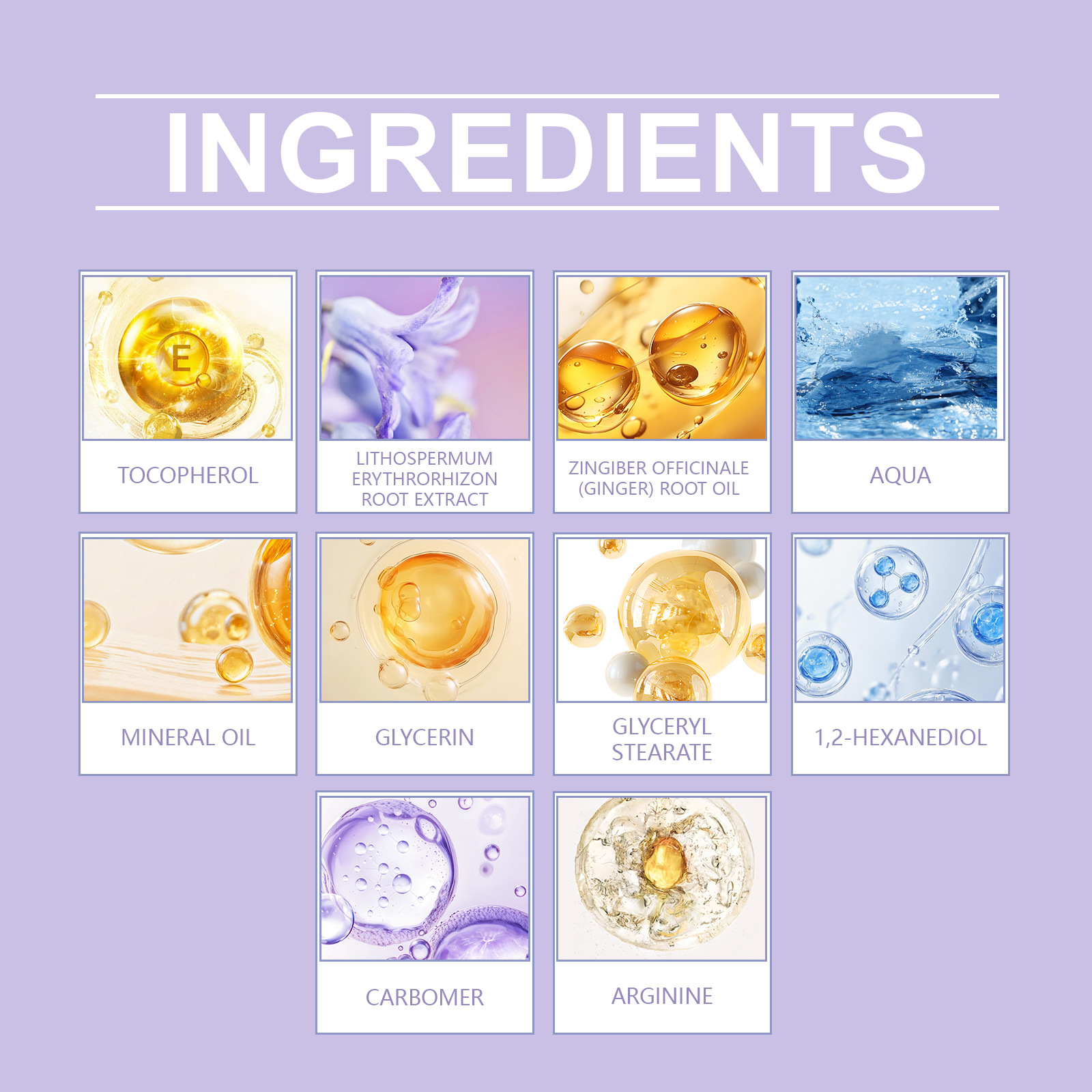 Active ingredients: tocopherol (vitamin E), Radix Arnebiae extract and ginger root oil.