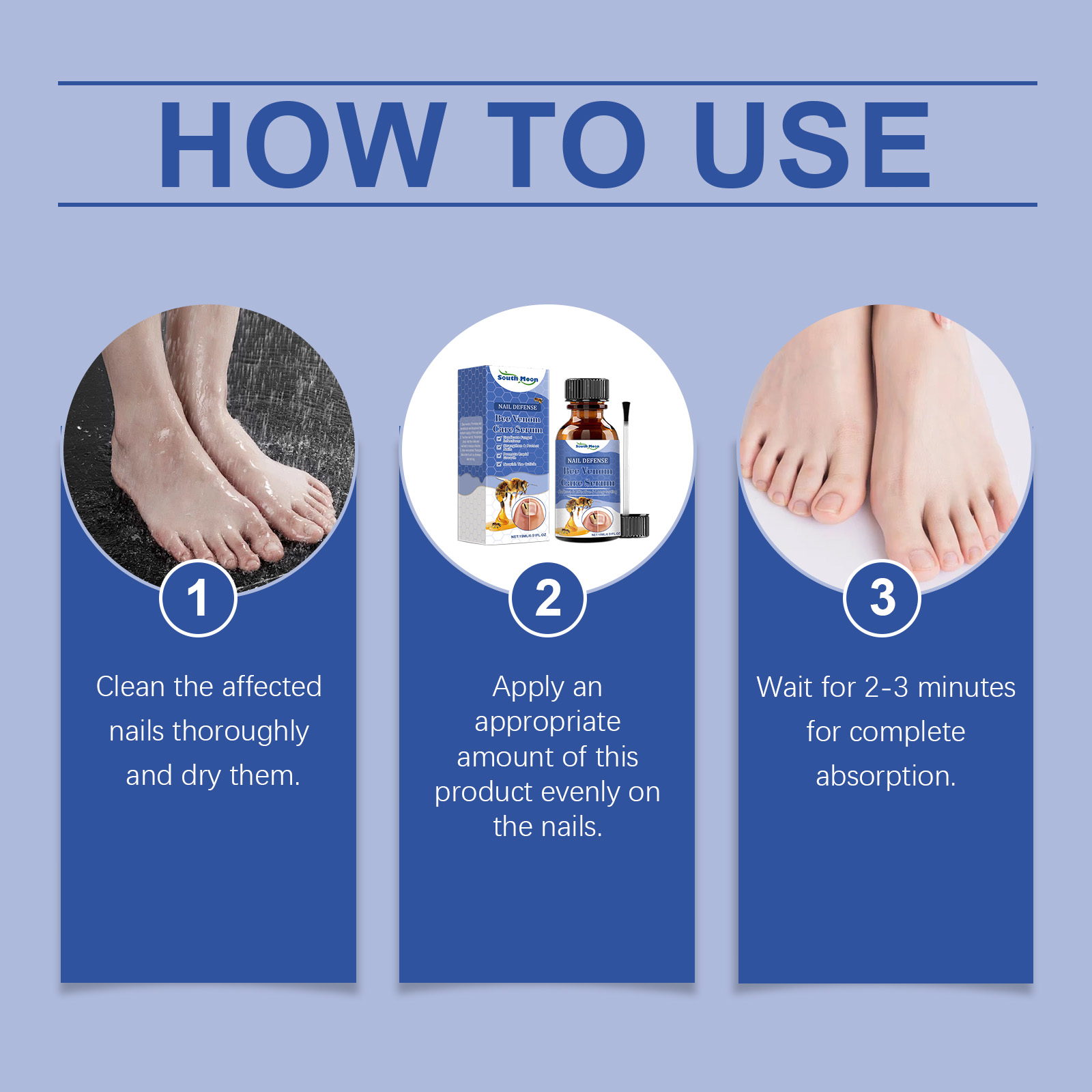 Our nail care solution contains Phellodendron extract, aloe leaf extract. It can deeply nourish nails and improve their resistance. Its use method is very simple: thoroughly clean the affected nail, and let it dry, apply an appropriate amount of this product evenly on the nail, wait 2-3 minutes before completely absorbed. And speed up nail thickening.