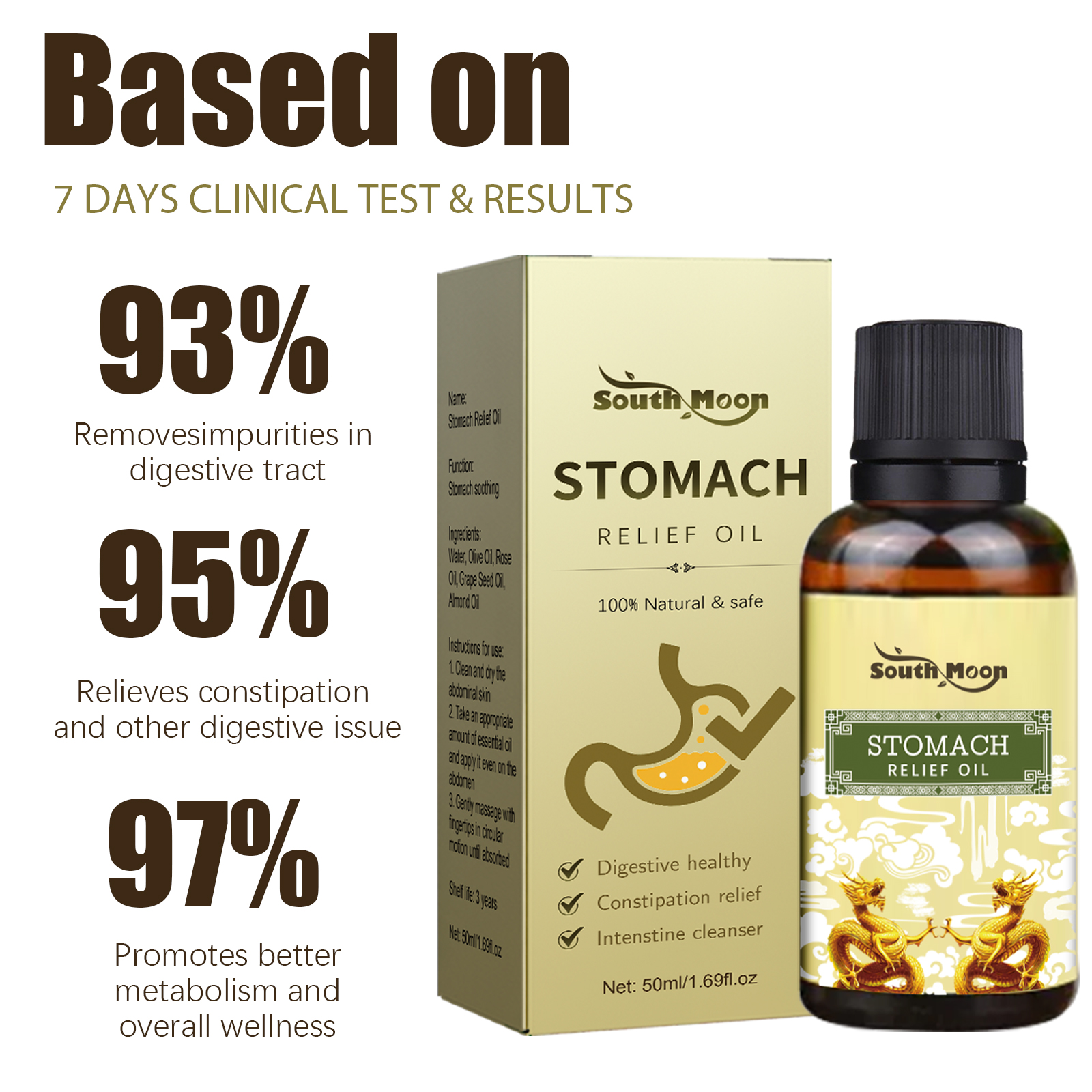 Our Stomach Relief Oil contains olive oil, rose oil and grapeseed oil. It can remove impurities from the digestive tube, relieve constipation and other digestive problems, promote a better metabolism, and maintain overall health. Its use method is very simple: clean and dry the abdomen skin, apply appropriate amount of this product evenly on the abdomen, gently massage in circles until absorbed. Relieve constipation, bloating, diarrhea, and heartburn, improve bad breath, and help remove toxins that accumulate over time.