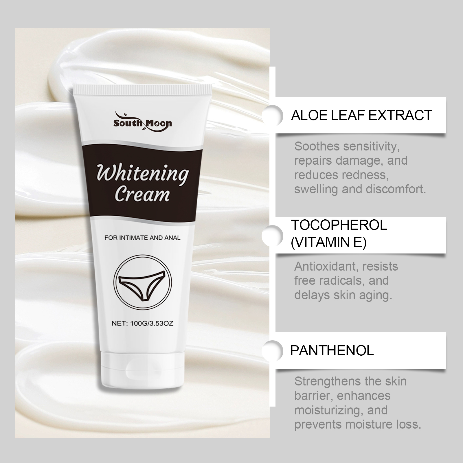 Our feminine beauty cream contains aloe vera leaf extract and tocopherol. It can dilute dullness and restore bright skin. Improve skin elasticity, make it firm and fashionable. Strengthens the skin barrier and reduces irritation. Its application method is very simple: clean and dry the skin in and around the private area, apply an appropriate amount of this product evenly on the skin of the private area, gently massage until absorbed. And it can effectively resist oxidation, resist free radicals, and delay aging.