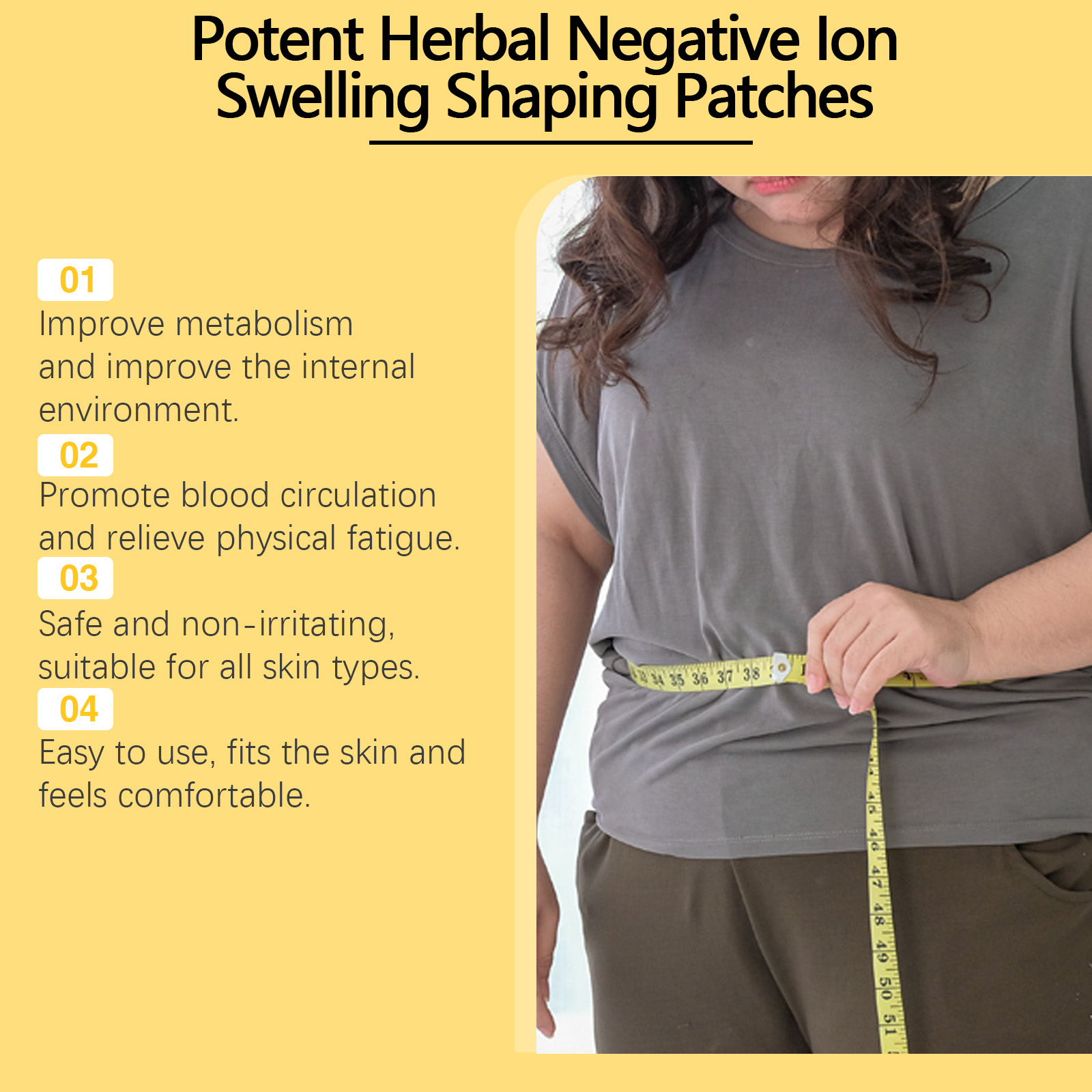 Our firming body patches contain wormwood extract, ginger root extract. It is effective in relieving joint discomfort. Promotes fat metabolism and shapes the body. Its application is simple: clean the navel area and keep it dry, remove the patch to peel off the protective film, and smoothly apply it to the navel and surrounding area. Press lightly, making sure the entire patch fits perfectly against the skin. It can also relieve arthritis pain and reduce inflammation.