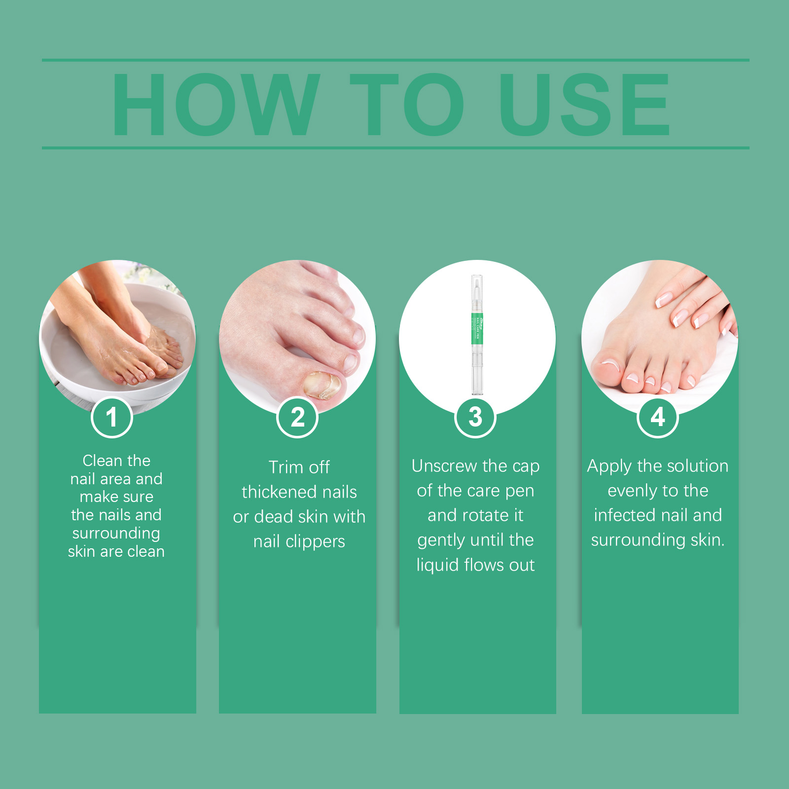 Our nail repair pens contain honeysuckle extract, lavender extract, tea tree oil. It can quickly penetrate nails, repair damaged areas, and restore a healthy glow. Keep your nails healthy by preventing fungal recurrence for a long time. Its application method is simple: 1. Clean the nail area and ensure that the nail and surrounding skin are clean; 2. Use nail clippers to cut off thickened nails or dead skin. 3. Unscrew the lid of the pen and gently rotate it until the liquid flows out; 4. Apply the solution evenly to the affected nail and surrounding skin. Nail repair pens can provide deep repair, promote healthy nail growth and repair damaged tissue.