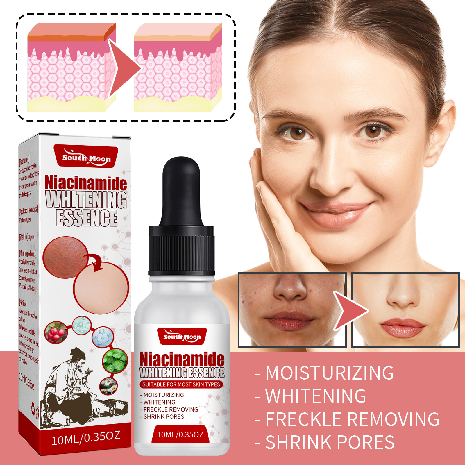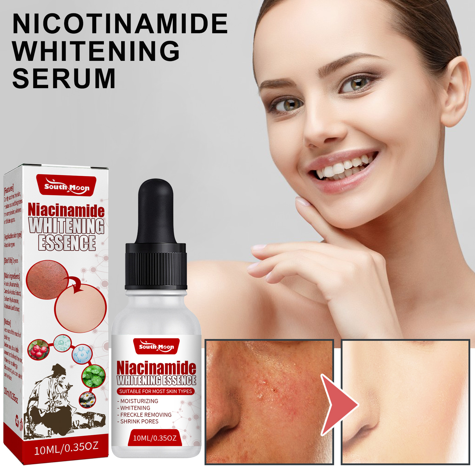 Our nicotinamide beauty serum contains nicotinamide, arbutin, and Asiaticum. It can improve the dullness of the skin, make the skin white and bright, deep soothing and repair the skin. Its application method is very simple: first clean and dry the skin, then apply an appropriate amount of this product evenly on the face, gently massage until the skin is completely absorbed. Nicotinamide Beauty Essence is a natural ingredient that brighens skin, reduces shadows and moisturizes deeply.