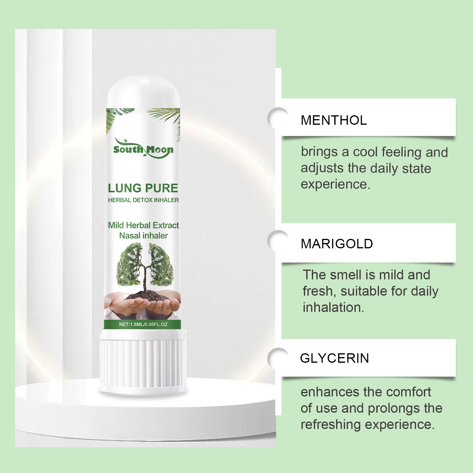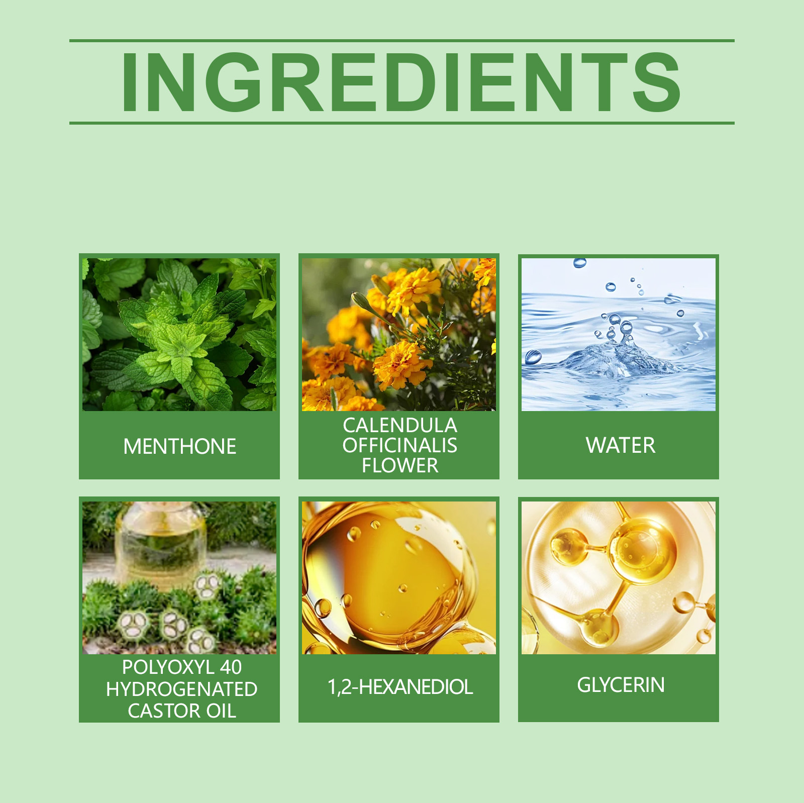 Product Ingredients: Active ingredients: Menthol, marigold; Inactive ingredients: Water, PEG-40 hydrogenated castor oil, 1, 2-hexanediol, glycerin