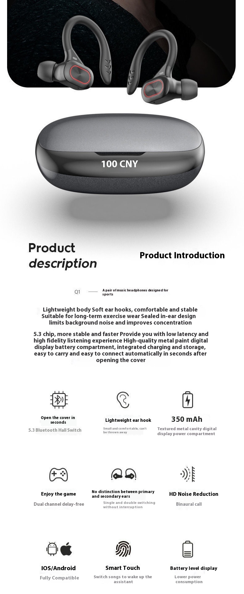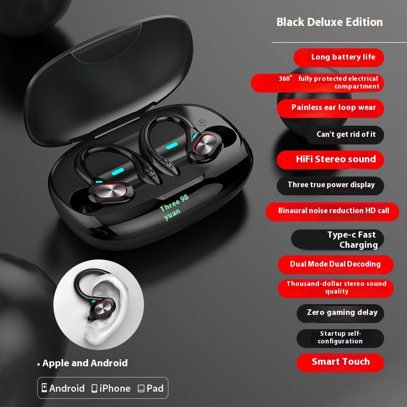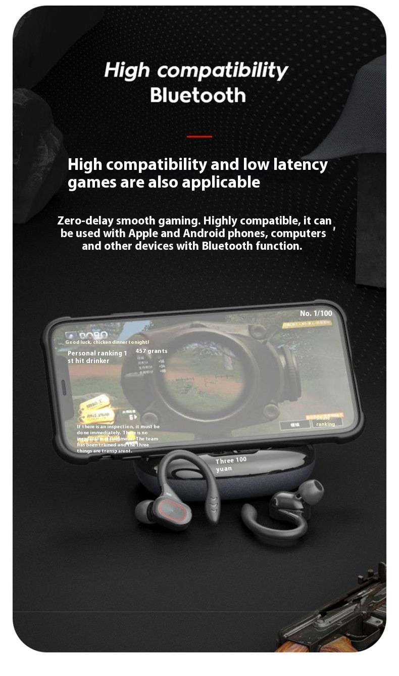 Functions: noise reduction, bone conduction, ultra-long life battery battery, call function, support for music, digital display, e-sports low latency