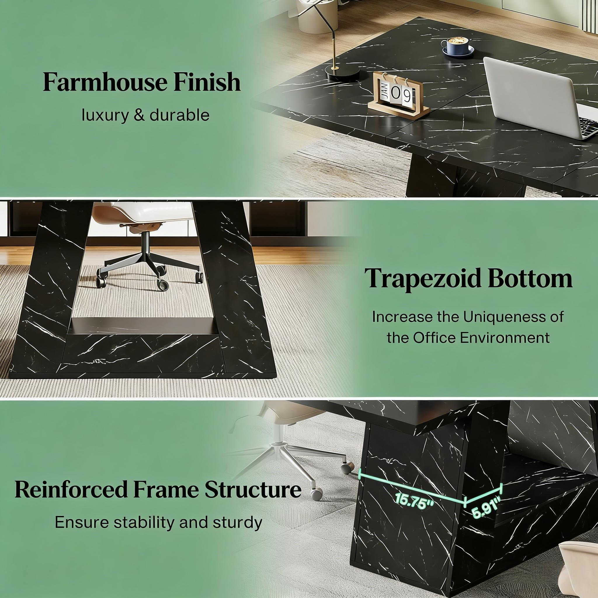 Important Reminder!!! 1) Attention: All products in our store do not support Canada self pickup ordering. Please do not create shipping labels for Canada. Our American products do not support self pickup to Canada 2)We do not ship to Alaska, Hawaii, US protectorates (e.g., Puerto Rico), P.O. boxes, or APO/FPO addresse 3)We don’t accept non-defective remorse returns Spacious Work Area - The office computer desk measures 31.5"D x 63"W x 29.53"H, providing ample space for computers, books, printers, and other office accessories. It's ideal for use in a conference or reception room. Contemporary Design - Add style to your workspace with this large, wooden desk featuring a chic faux marble veneer and unique trapezoidal leg design. Robust Construction - The executive desk is constructed with sturdy materials including a thick 1.18-inch desktop and trapezoidal leg for stability. Versatile Use - This desk doubles as an executive desk, computer desk, conference table or even as a dining table, making it a standout piece of furniture in your home. Hassle-free Assembly - The desk comes with easy-to-follow instructions, pre-numbered parts, and necessary tools. Our dedicated support team is on hand to assist if needed.