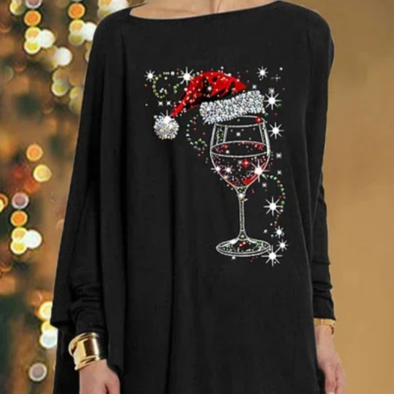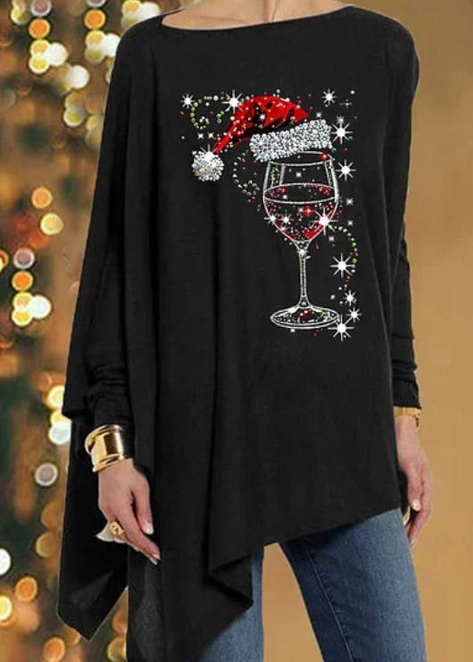 Sparkling Christmas Wine Glasses Printed Mid-Length Irregular Women's Tops