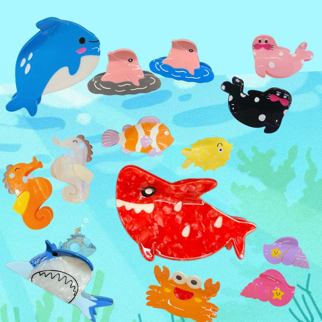 Color: crab, Red Shark pattern, dancing whale, dolphin Blue, Dolphin gray, Conch rose red, conch purple, seal Black, seal pink, Triangle fish orange, Triangle fish pink, Seahorse orange, Seahorse mermaid color, puffer fish, kiss fish, pink whale